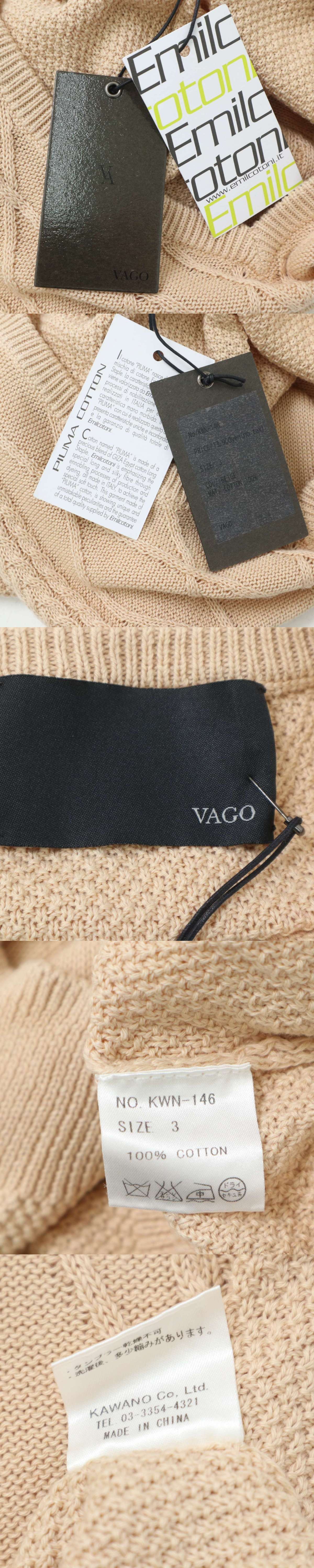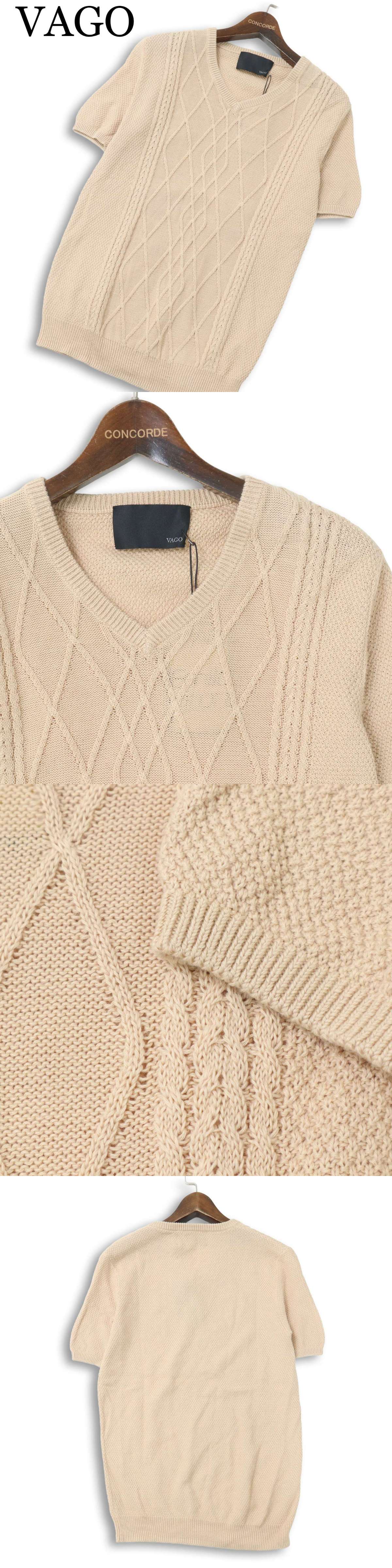 新品 未使用★ VAGO ヴァーゴ 新宿KAWANO カワノ Vネック ケーブル編み 半袖 コットン セーター ニット Tシャツ Sz.3 メンズ