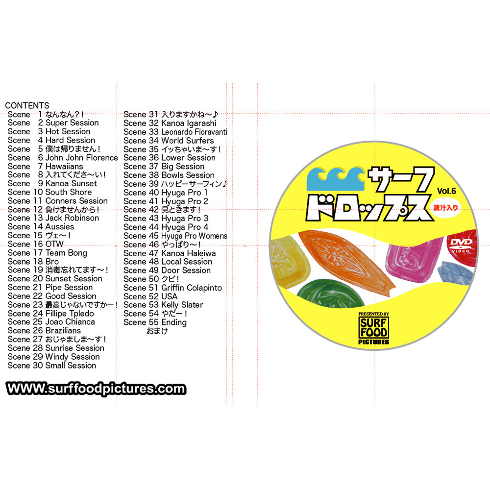 サーフフード「サーフドロップスVol.6」 5/21 発売、5/22から順次発送開始! 今回は、カノア五十嵐 推しになっていてカノアサーフィンがたっぷり。 ジャックロボ、イーサン、グリフィン、オレアリー、チアンカ等 今、旬なサーファーもたっぷりと出てきます。 もちろん、ケリーやジョンジョンのサーフィンも収録。 また、ジャパニーズプロのサーフシーンも盛りだくさん。 丸出だめ夫の芝居シーンはダブルカナに挟まれて面白い展開に。 総勢112名のトップサーファーに、173分と内容量たっぷり、最先端のサーフィンをお届けします!