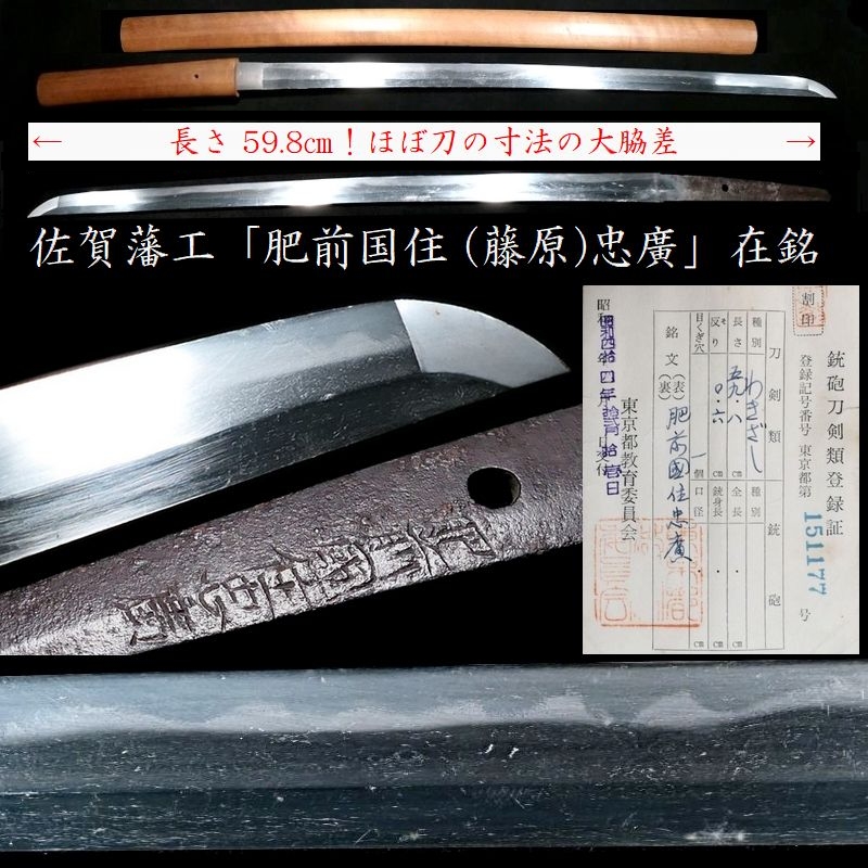 string(155) "ほぼ刀の寸法! 59.8cmの大脇差 「肥前国住(藤原)忠廣」在銘 しっかりとした力強き刃文の一振り 【安値出発】k462"