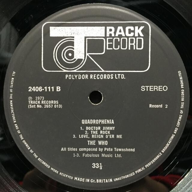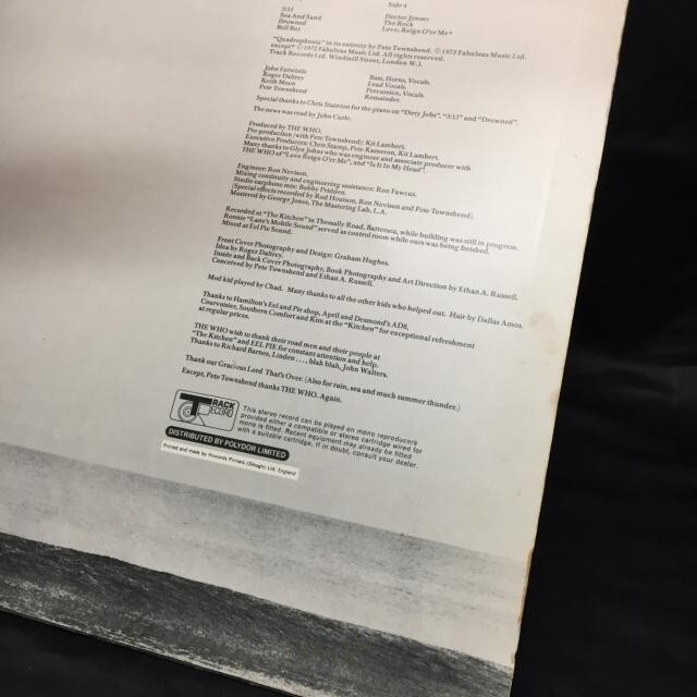 | 【アーティスト】 THE WHO 【タイトル】 QUADROPHONIA 【規格番号】 2657013 【商品説明】 UK盤/2LP/UK HOWARDS SLEEVE(激レア)/NON FLAT LABEL MAT:4/3/4/3 w/BOOKLET(外れ) 【状態】 EX/EX |