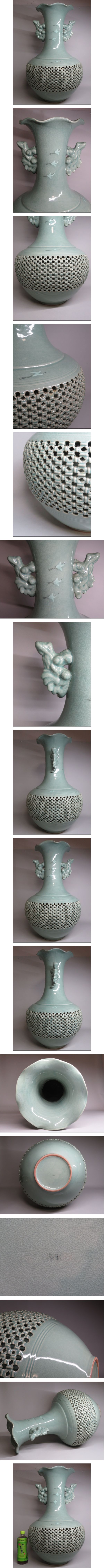 | 柳海剛 韓国人間文化財(柳根瀅) 高麗青磁 象嵌鶴文網目透かし彫り大花瓶 H63.5cm 韓国 人間国宝 柳海剛 ◆李朝/高麗 海剛 | ||||