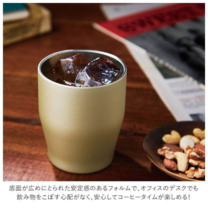 ・飲み口がオープンになったタンブラーながら、真空二重構造なので、冷たい飲み物や温かいコーヒーも飲み頃温度を保って長く楽しめる。