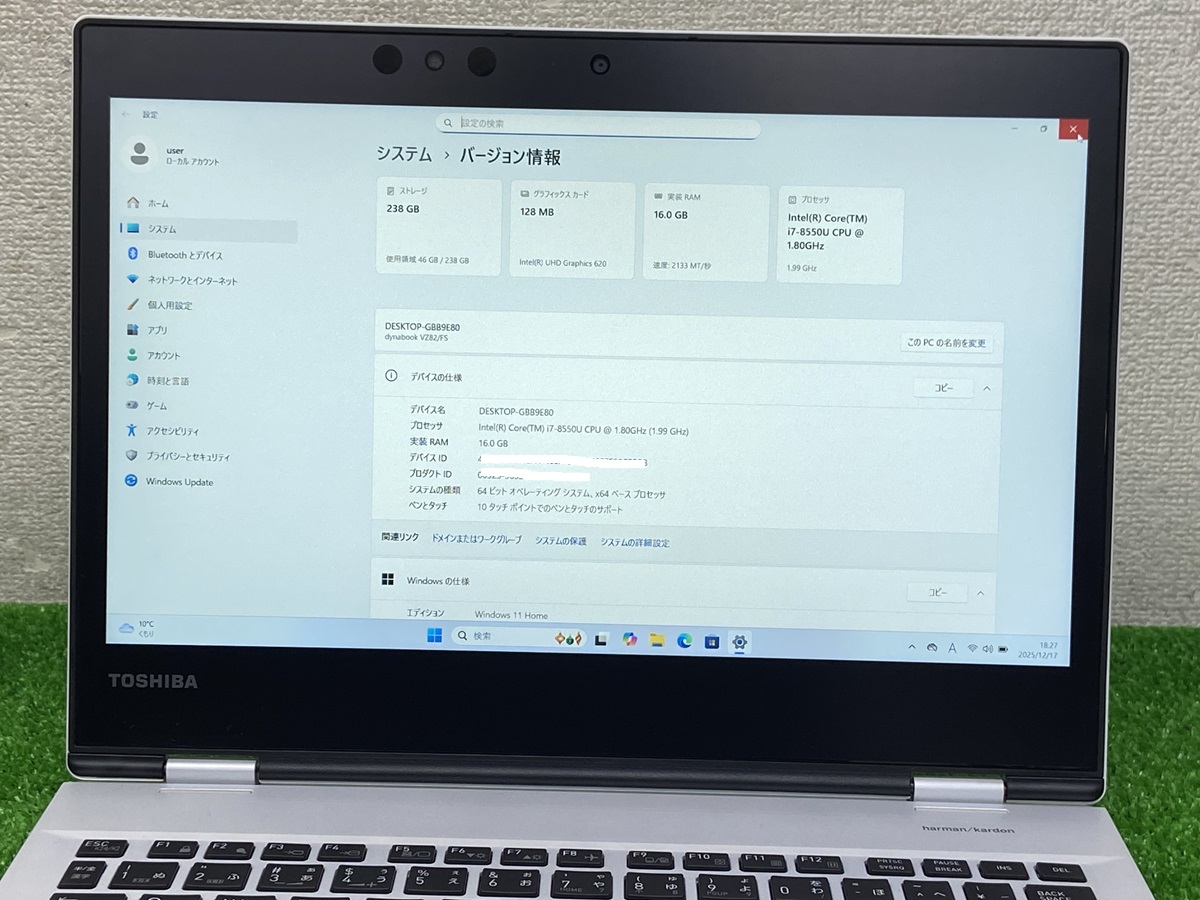 Toshiba Dynabook V82/FS PV82FS-NEA 東芝ノートパソコン中古 i7第8世代 メモリ16GB SSD256GB 12.5 Touch Screen laptop タブレット