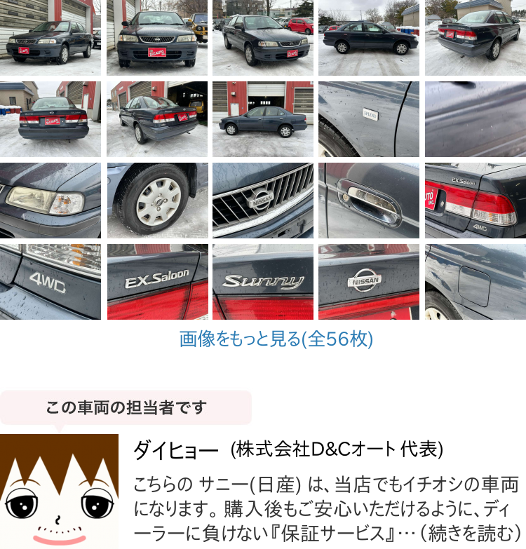 string(109) "【諸費用コミ】:札幌発【安心の指定工場あり】 平成12年 サニー 1.5 EXサルーン 4WD"
