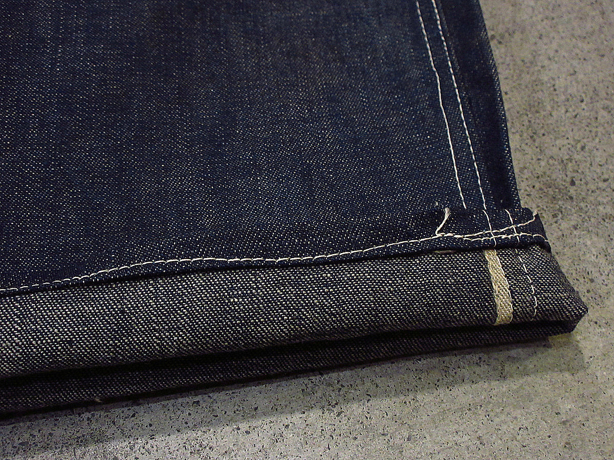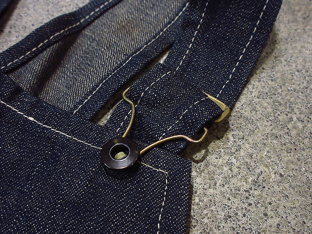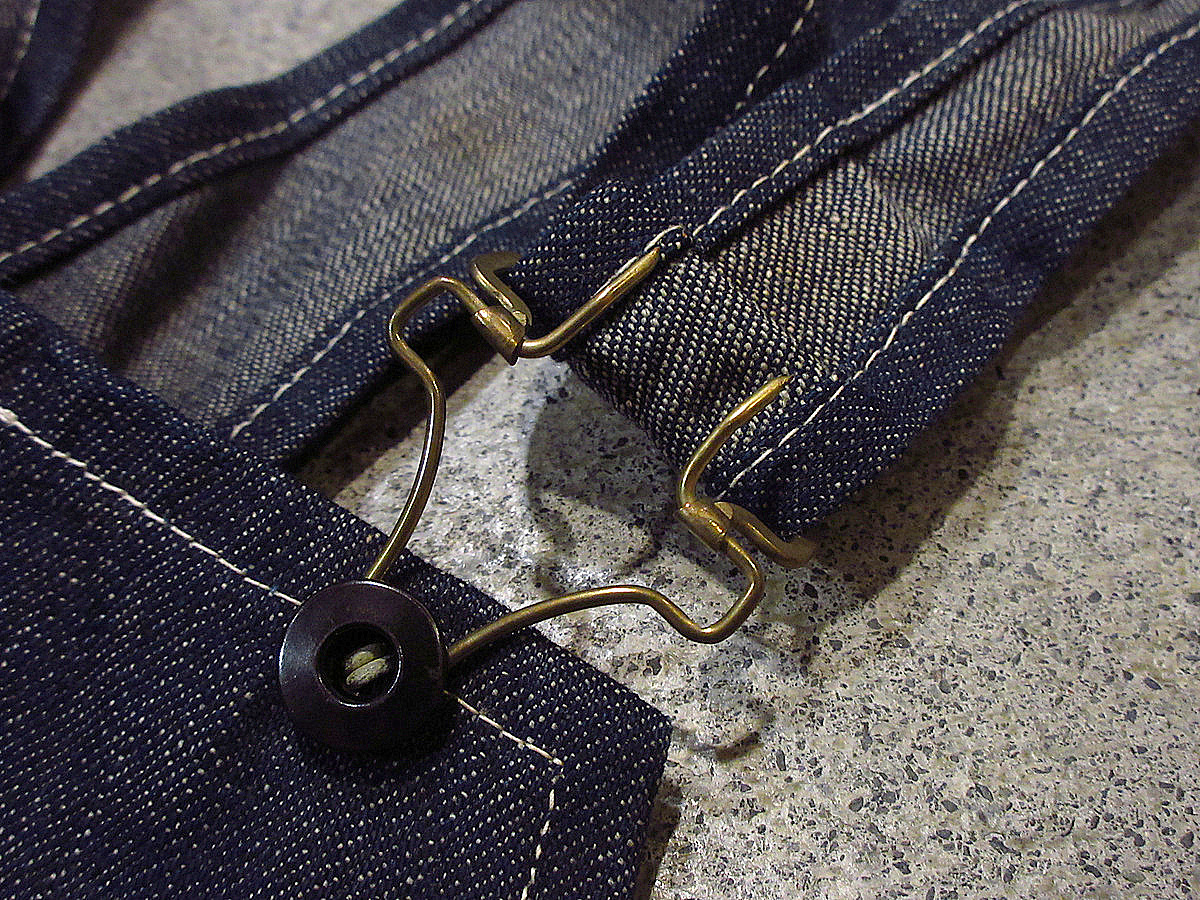 二本針のストラップ金具、黒ラッカーメタルボタン、ボタンフライ
