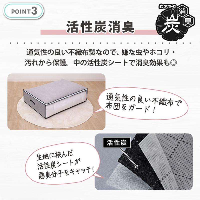 ●活性炭のチカラで消臭保管。活性炭シートがにおいをしっかり消臭。大切な布団や衣類などをにおい・ホコリ・汚れからしっかり守る。
