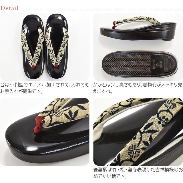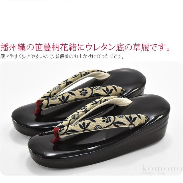 | 備考 | : | 播州織の笹蔓柄花緒にウレタン底の草履です。 台は小判型でエナメル加工されて、汚れてもお手入れが簡単です。 ウレタン底は耐久性に優れ、雨の日も安心です。 笹蔓柄は竹・松・蔓を表現した吉祥模様のおめでたい柄です。 かかとは少し高さもあり、着物姿がスッキリ見えますね。 履きやすく歩きやすいので、普段着のお出かけにぴったりです。 共布のバッグはこちらから購入できます。 共布のバッグセットはこちらから購入できます。 ※台の巻きと底の色はロットにより黒またはこげ茶色になる場合があります。 ※台に小さな傷、へこみがある場合がありますが製造上やむを得ない仕様で不良ではありません。 ※天の縁の仕上がりが画像のような箇所がありますが、制作上やむを得ない仕様で不良ではありません。 ※鼻緒の柄の出方はお任せとなります。 ※商品の構造上、鼻緒の挿げ穴がないため、鼻緒の調整・挿げ替えはできません。 ※外箱に難がある場合があります。 | ||||||