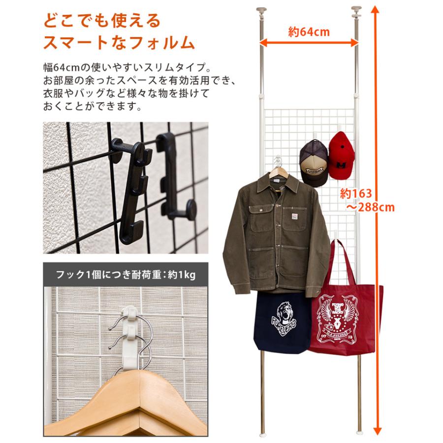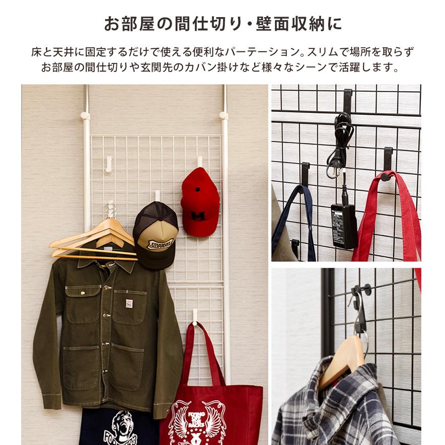 | 商品説明 | 組立品(約10分) つっぱり式でらくらく設置! 使い道いろいろのパーテーションです!! つっぱり式なので薄型で場所を取りません! メッシュになっているので、両面にフックを使って帽子やバッグ、服などを収納出来ます。 市販のフックやラックなどと組み合わせれば、いろいろな使い道が広がりますね。 組立ても特に工具などは必要ありませんので、女性でも簡単です。 部屋の間仕切りに使ったり、壁際やデスクの後ろなどに置いて収納を増やしたりしてもいいですね。 |