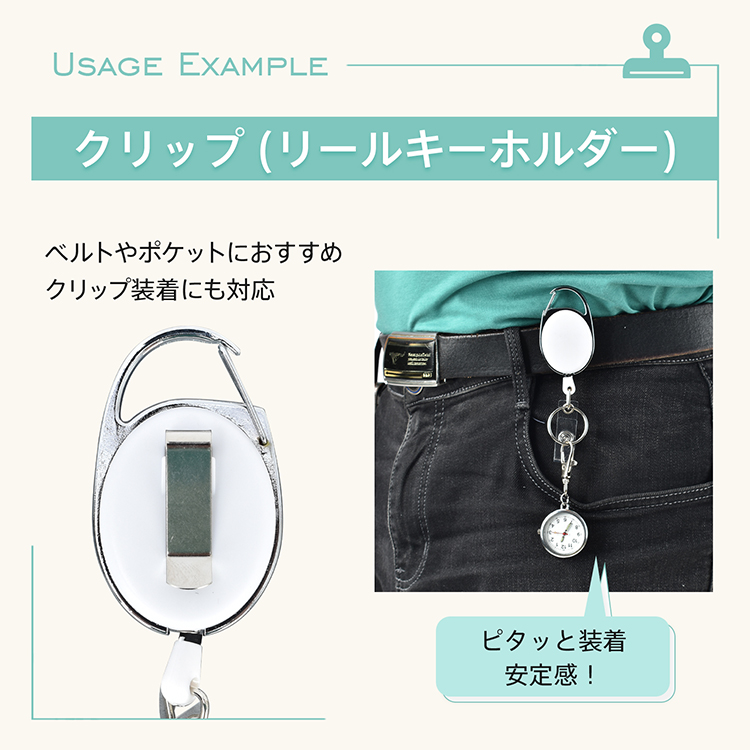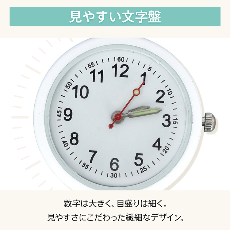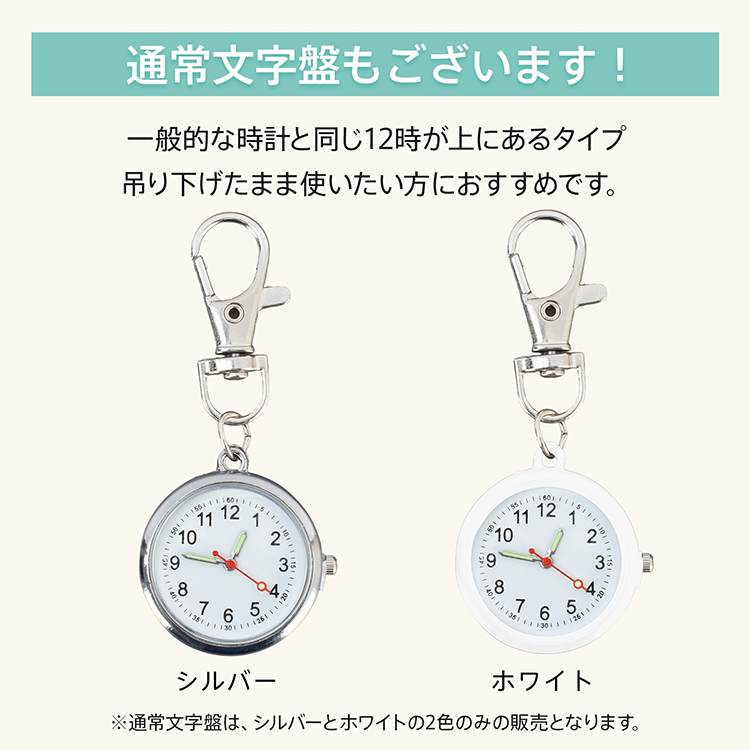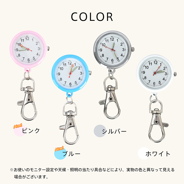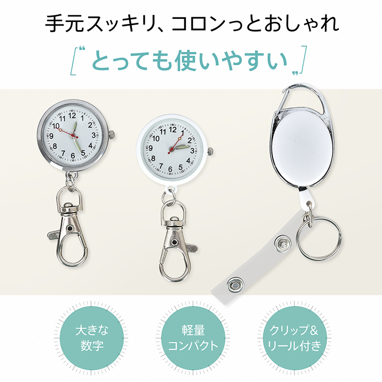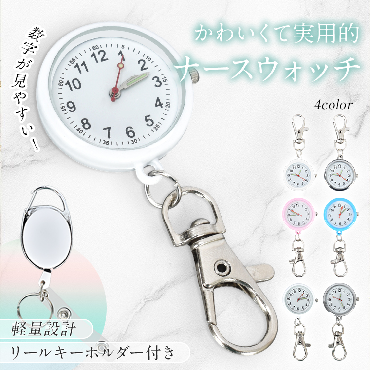 | 種類・サイズ | ・カラー:ホワイト、シルバー、ピンク、ブルー (通常文字盤はホワイト、シルバーのみ) ・ナースウォッチサイズ:(約)3cm×7cm ・リールキーホルダーサイズ:(約)3cm×9.5cm~74.5cm |