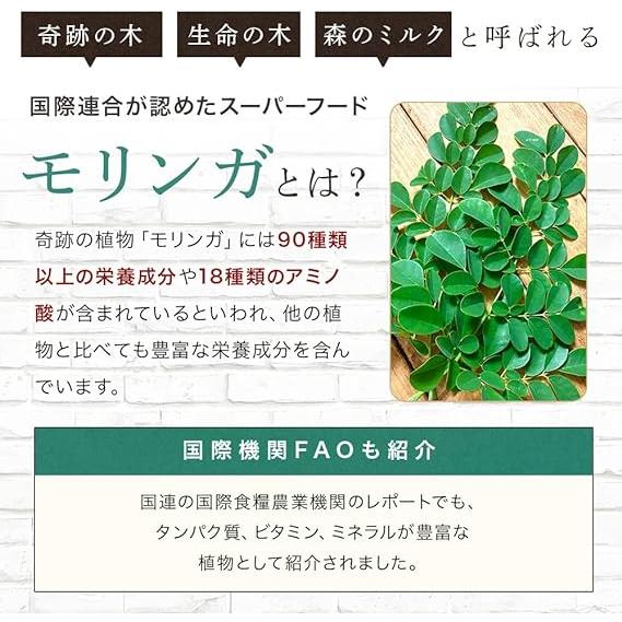 ・モリンガとは:モリンガは、ワサビノキ科の落葉小高木で、インドを原産とする植物です。優れた生命力を持ち、成長が非常に速いことから、人にも何らかのパワーを与えると考えられていました。近年になって、モリンガの栄養の豊富さや接種のしやすさに注目が集まり、様々な健康食品に転用されています。