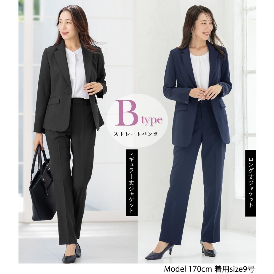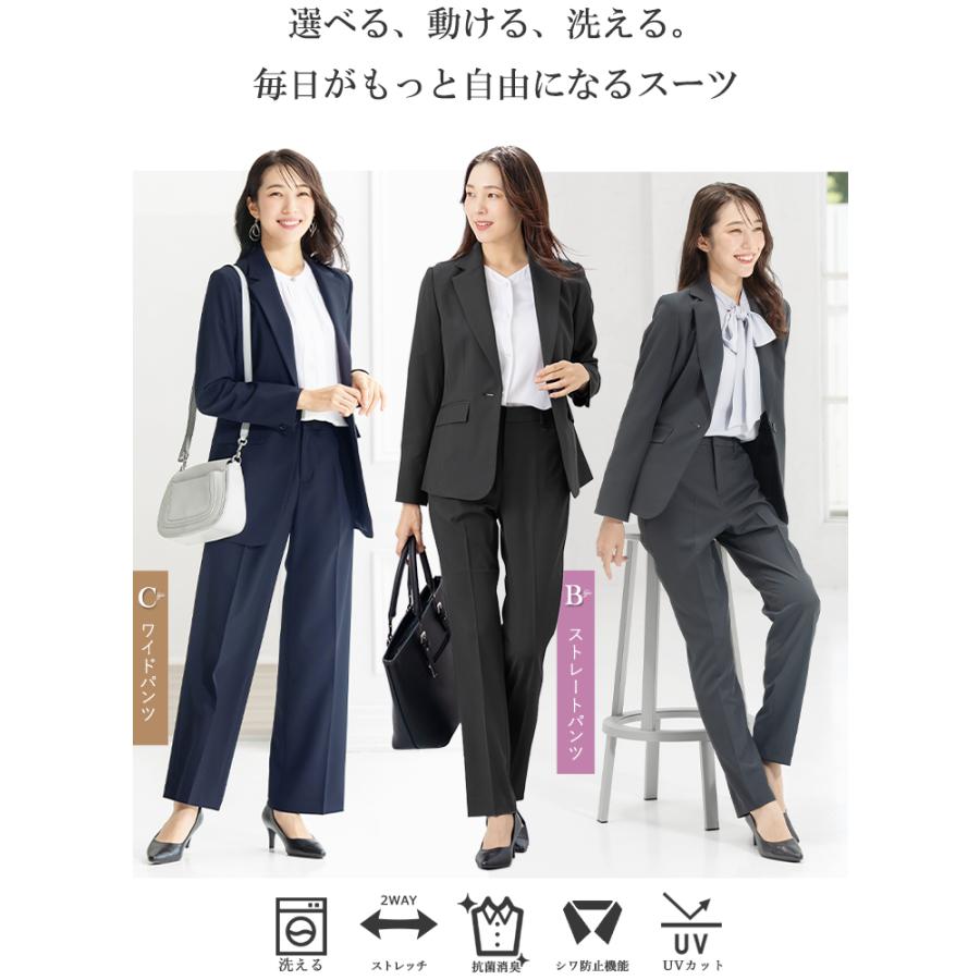 ご家庭の洗濯機で洗える≪ウォッシャブル≫機能が特徴のストレッチ素材パンツスーツです。ビジネススーツの定番として、飽きのこないきれいめデザイン。