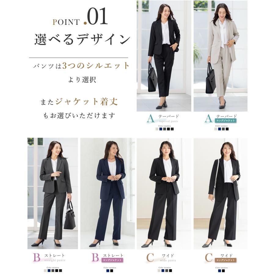 おしゃれが好きな女性に向けて、パンツは選べる3デザイン。裾が引き締まったシルエットで美脚が叶うテーパードパンツと、大人カッコいいスマートなシルエットのストレートパンツ、エレガントなシルエットで体型カバーもできるワイドパンツをご用意しました。