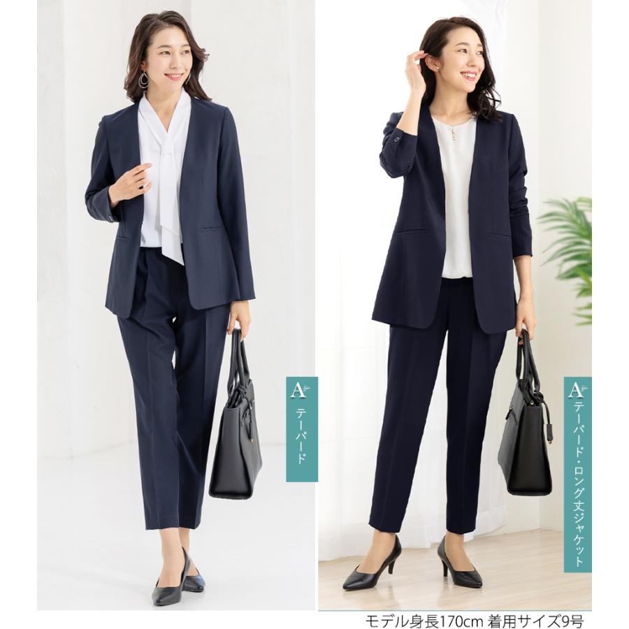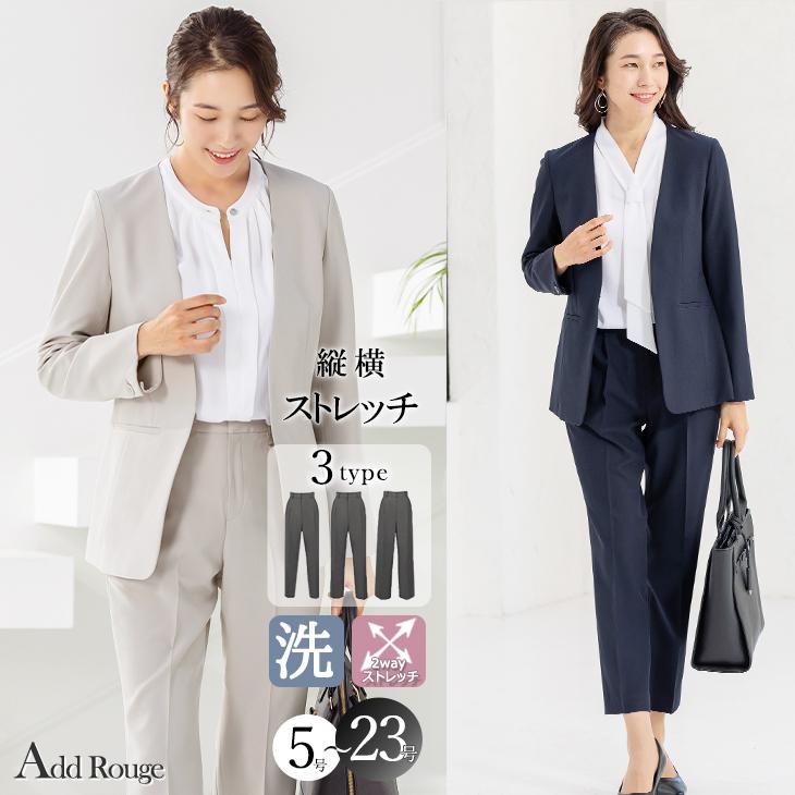パンツは美脚が叶うテーパードと、王道シルエットのストレート、エレガントに体型カバーできるワイドから選べる、3デザインをご用意。ウエストの後ろがゴム入りなので、長時間ストレスなく着用いただけます。