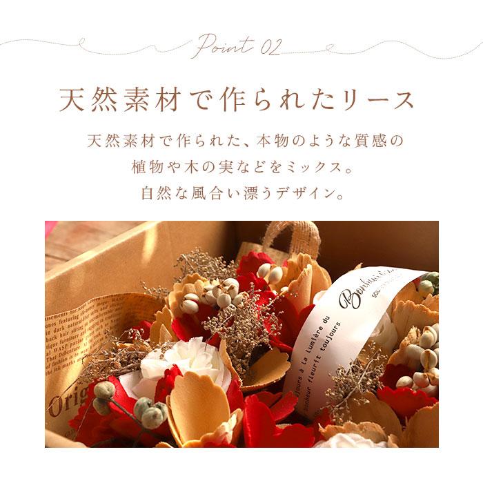 | 商品説明 | ・天然素材を使用♪優しい色味で仕上げた「ナチュラル リース Sサイズ」が登場! 【こだわりの天然素材】 ・天然素材で作られた木の実や花をふんだんに使用!自然な雰囲気が魅力のナチュラルカラーリース♪ 【手軽にお花をインテリアに♪】 ・お手入れが大変な生花と違い、水やりなどのお世話が必要なく季節問わず装飾できるのが嬉しいポイント! 【優しくお部屋を彩る】 ・可愛らしいお部屋には自然に馴染み、シンプルなお部屋にはアクセントに☆場所を選ばずインテリアを優しく彩る♪ 【気軽に飾れるSサイズ】 ・小ぶりなつくりのSサイズなので、トイレや玄関などの小さな空間でも気軽に飾れてGOOD◎ 【専用BOX付】 ・英字新聞の梱包とオシャレなタグがチラッとのぞく専用BOX付きなので、大切な人への贈り物にもオススメ♪ |