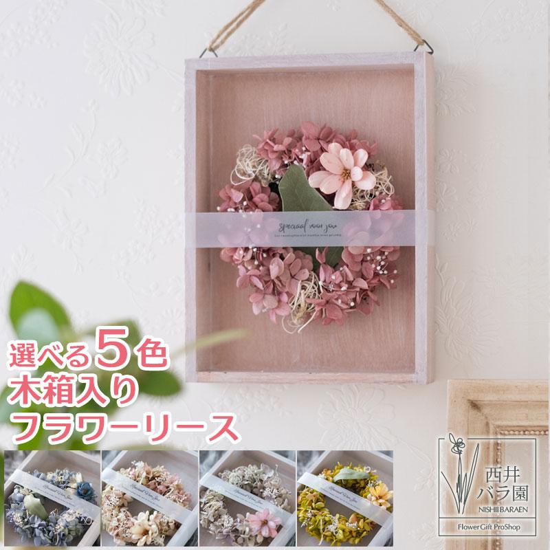 リースはシャビーシックなウッドフレームボックスに入れています。