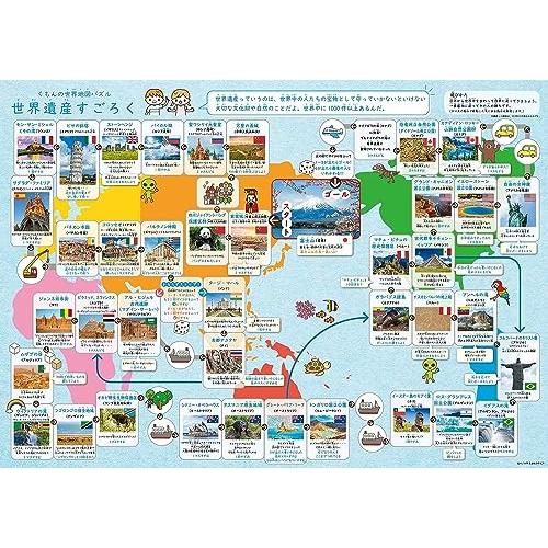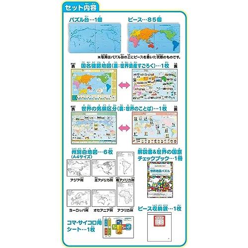 パズル台:1個、国別ピース:85個、国名確認地図(裏面:世界の遺産すごろく)、世界の気候区分(裏面:世界のことば)、:各1枚、州別白地図:6枚、ピース収納袋:1枚、解説書&世界の国旗チェックブック、コマ・サイコロ用シート:各1