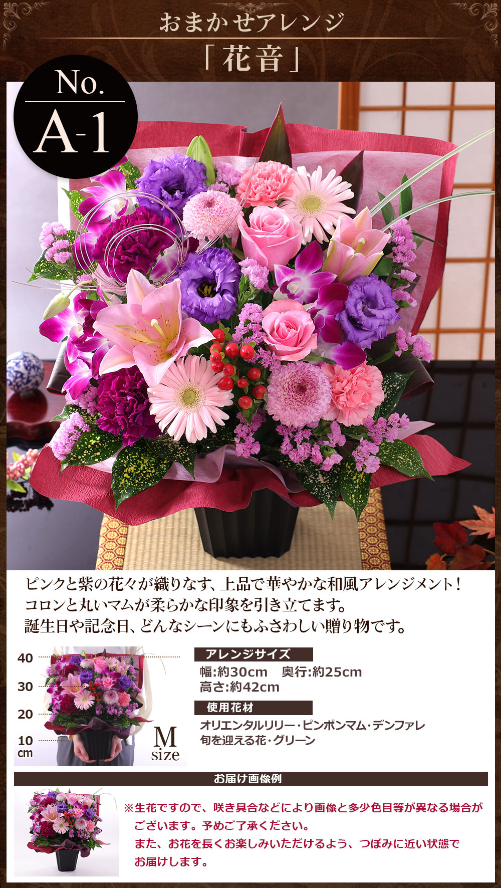 当店人気No1の選べるアレンジメント10種類以上!旬のお花を使ったボリューム感あふれるアレンジです。 記念日や歓送迎などのギフトに是非お使いください!
