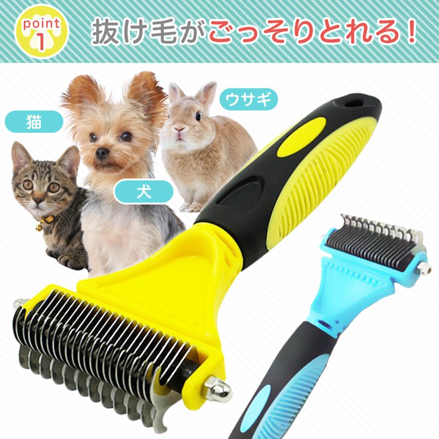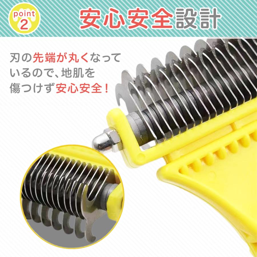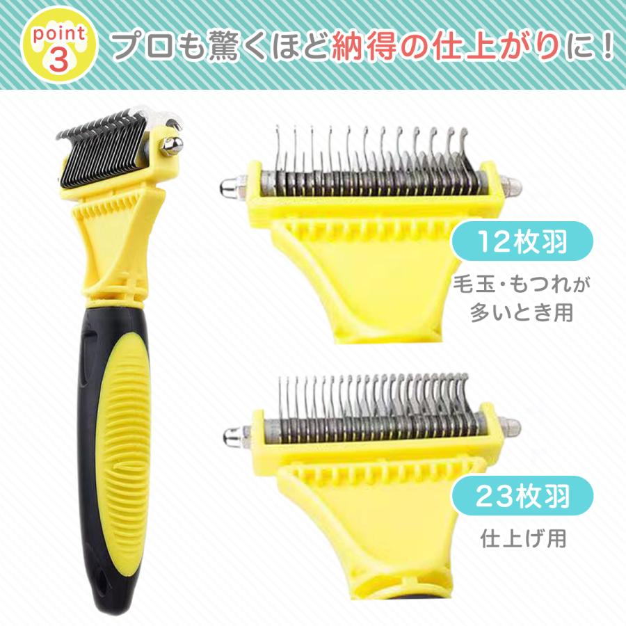 粗目(12枚刃)で毛玉や絡まりをほぐし、細目(23枚刃)で抜け毛をごっそり取り除きます。