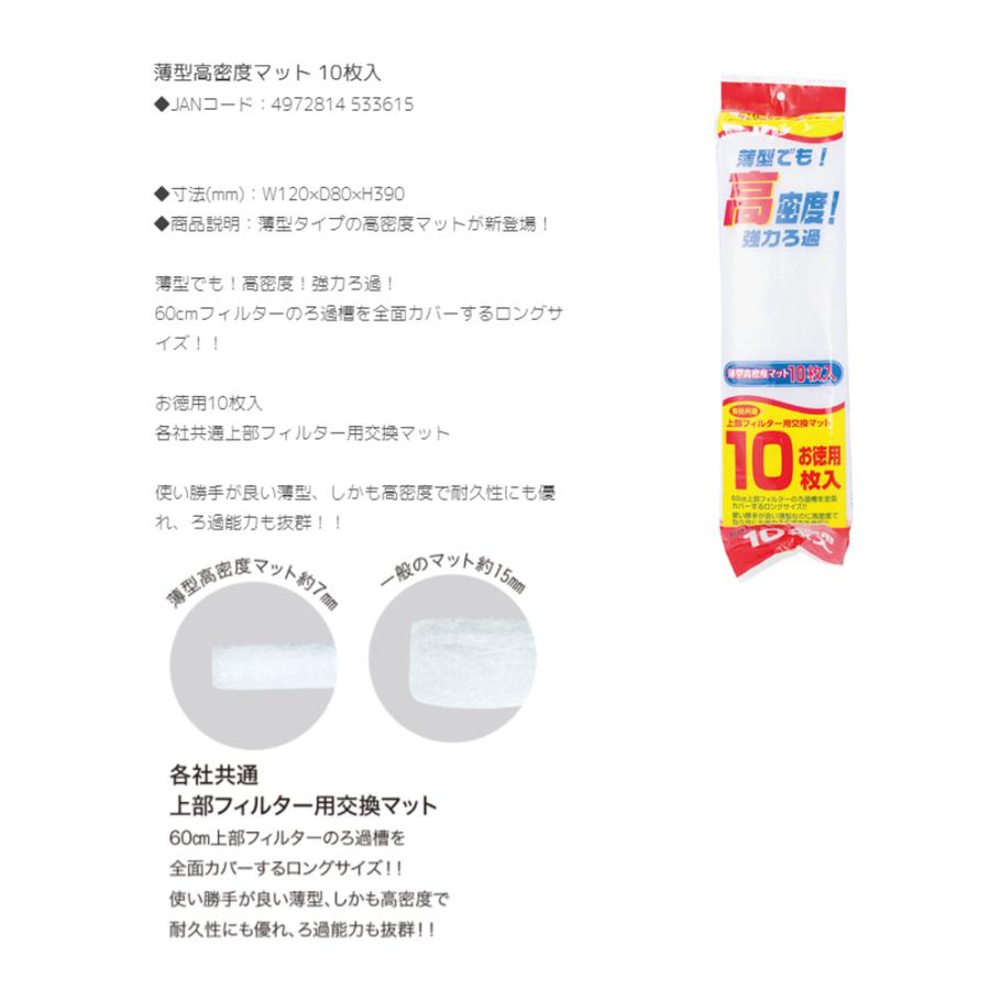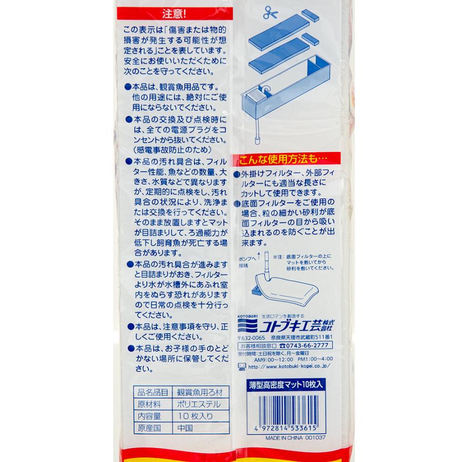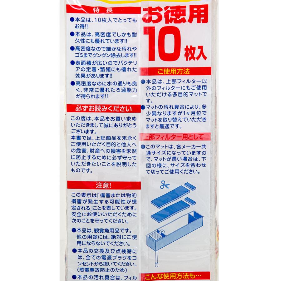 | 特長 | ●60cm上部フィルターのろ過槽を前面カバーするロングサイズのろ過マットです。 ●うれしい10枚入りです。 ●高密度で、しかも耐久性にも優れています。 ●高密度なので細かな汚れやゴミまでグングン除去します。 ●表面積が広いのでバクテリアの定着・繁殖にも優れた効果があります。 ●高密度なのに水の通りもよく、非常に優れたろ過能力が得られます。 |