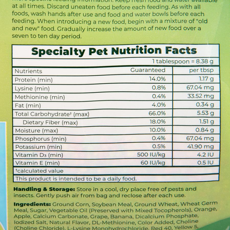 | 特長 | ●健康管理と維持に必要な栄養を考えたバランスフードです。主食としてご使用頂けます。 ●ビタミン・ミネラルを豊富に含み、人工防腐剤や保存料などペットに有害なものは含まれておりません。 ●ペレットは着色料を使用しております。着色料は体内吸収されず、糞と共に排出されますので安心してご使用いただけます。 ●ズプリームフルーツブレンドは、健康維持に必要なビタミン・ミネラルなどの栄養素を毎日の食事から補給できます。 ●1日の食事量の60%以上与えて下さい。北米の大地で育った天然穀物をふんだんに使用し、かじるごとに美味しく、楽しく食事を彩るペレットです。 ●アメリカの鳥専門獣医師や愛鳥家に高く評価されています。 ●シード類に不足するビタミン類、ミネラル類、アミノ酸類の栄養を強化しています。低脂質なので肝機能、循環器機能の健康をサポートします。 |