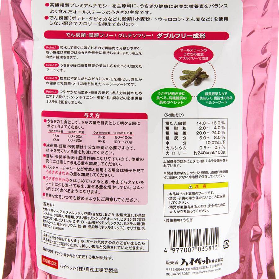 | 特長 | ●でん粉類・穀類フリー、グルテンフリーのダブルフリーで成形した、オールステージのうさぎの総合栄養食です。 ●粗挽きプレミアムチモシーを主原料に、ダブルフリー成形した、高繊維質、低カルシウムのヘルシーフードです。 ●高繊維質プレミアムチモシーを主原料に、うさぎの健康に必要な栄養素をバランスよく含んでいます。 ●でん粉類(ポテト・タピオカなど)、穀類(小麦粉・トウモロコシ・えん麦など)を使用しない配合でカロリーを抑えてあります。 ●うさぎが飽きずに食べる、高繊維質の長めのペレットです。 ●緑黄野菜入りで、美味しく、機能性のあるヘルシーフードです。 ●安心の国産品です。 |