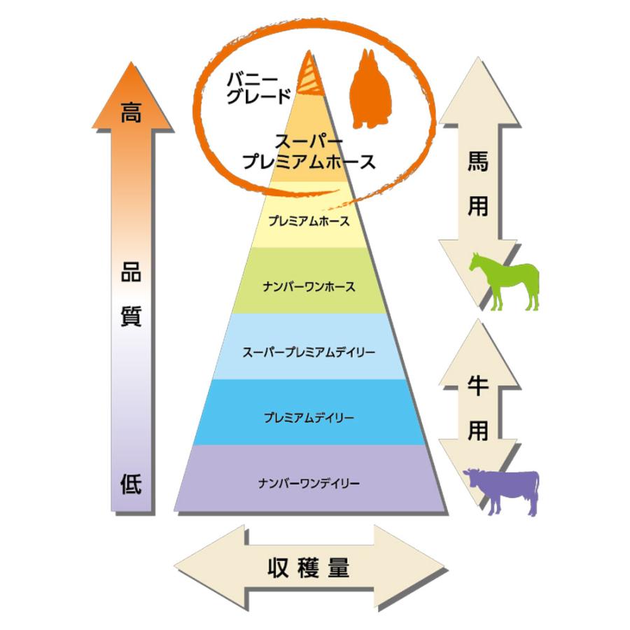 | 特長 | ●一番刈り・シングルプレスのチモシーです。 ●競走馬用グレードのチモシー「スーパープレミアムホース」の中から、香りが良く、嗜好性の高い高品質な牧草を厳選しました。 ●年に数回収穫されるチモシーの内、その年の一番初めに収穫されたもので、繊維質が豊富で栄養バランスにも優れています。 ●出荷時の圧縮率が低く、茎や穂のつぶれが抑えられ、より自然に近い状態を保っています。 |