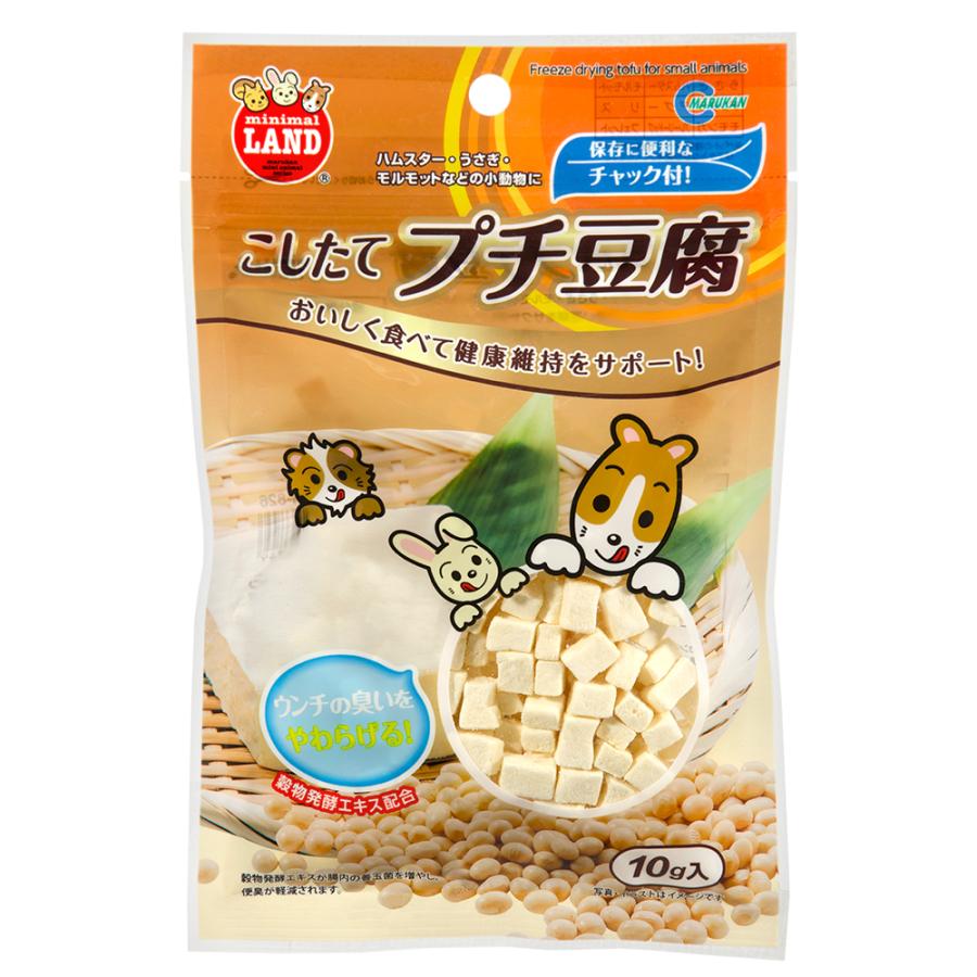 | 特長 | ●小さくて可愛い豆腐をサクサクに仕上げた、小動物用のおやつです。 ●おいしく食べて、タンパク質を摂取することができます。 ●ウンチの臭いをやわらげる、穀物発酵エキスを配合しました。 ●保存に便利なチャック付きです。 |