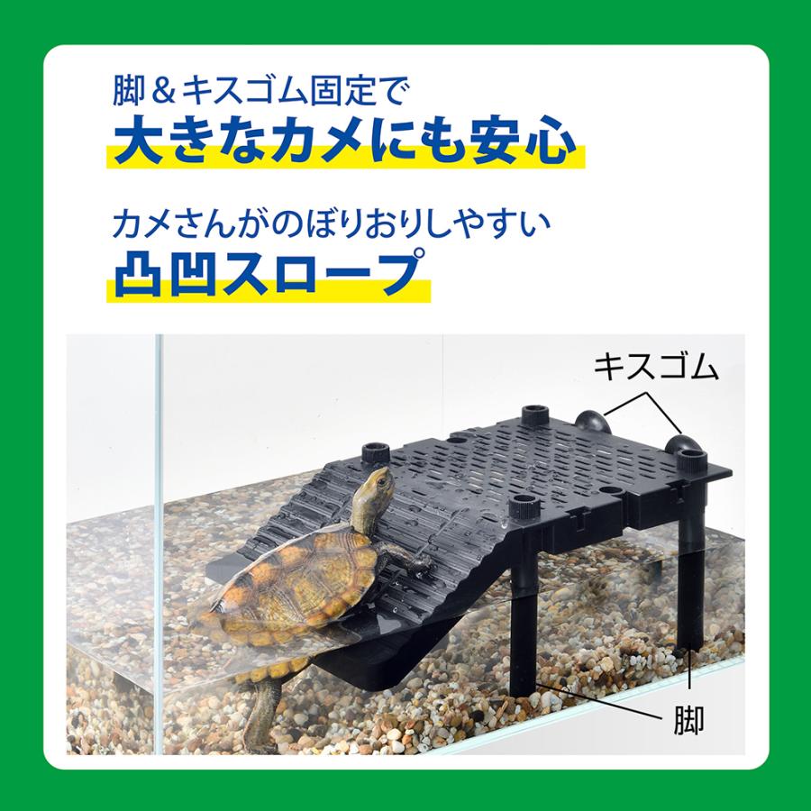 | 特徴 | ●カメの日光浴に最適な浮き島です。 ●小さなカメから大きなカメまで、安心して使用できます。 ●脚とキスゴム(吸盤)により、水槽にしっかりと固定できます。 ●のぼりおりしやすいように、スロープには凸凹加工が施されています。 ●複数購入することで連結して拡張でき、大きなカメや水槽にも対応可能!別売の「カメ元気 ダストキャッチフィルター」と接続して使用することができます。 |