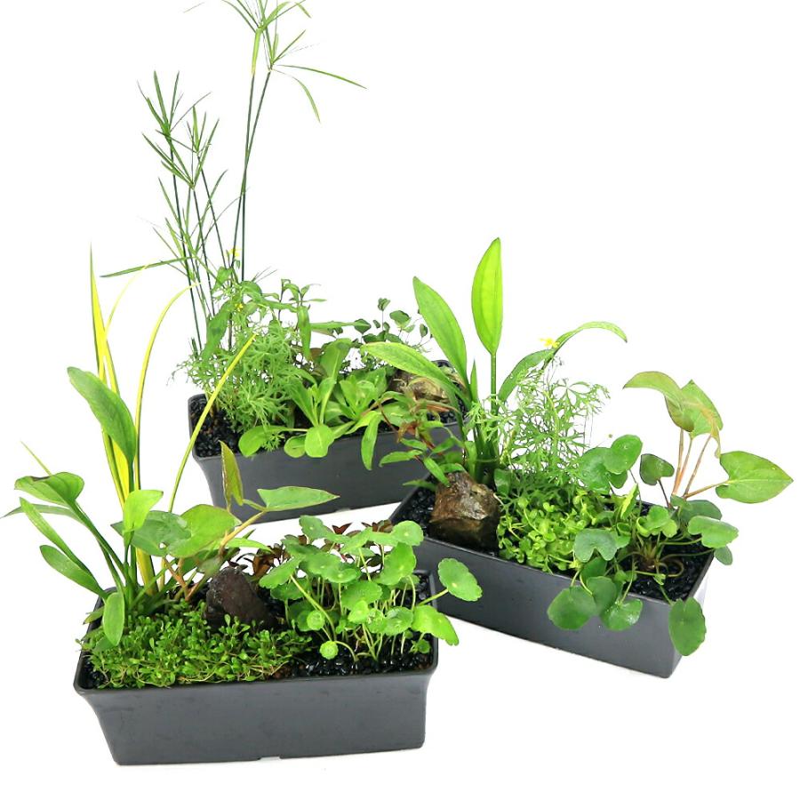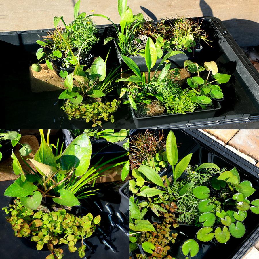 | 特徴 | ・予め寄せ植えになっていますので睡蓮鉢やトロ舟に沈めるだけで手軽にビオトープをお楽しみ頂けます。 ・水陸両用なので、完全に沈めての育成、腰水での育成が出来ますのでお好みに合わせてご使用頂けます。 ・お好みにより流木や石などのアクセサリーを追加する事でより本格的なレイアウトをお楽しみいただけます。 ・植物が生い茂ることで影を作り夏場の暑さ対策がや産卵床として期待できます。 |