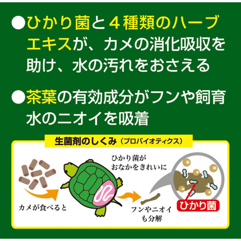 | 特長 | ●水の汚れとニオイを軽減 ひかり菌のプロバイオティクス効果と茶葉の消臭効果で水の汚れと臭いを抑えます。 ●おなかで働くひかり菌 生きたままひかり菌がカメの腸を整え、健康をサポートします。 ●カメに最適な配合 長期的な飼育、繁殖試験に基づいてカルシウムなどの必須成分をバランスよく配合しました。カメが必要とする栄養分を全て含んでいますので、本品だけで飼育できます。 ●4種類のハーブエキスを新配合 健康ハーブがカメの消化吸収をサポートすることでフンが減り、消臭効果もアップしました。 |