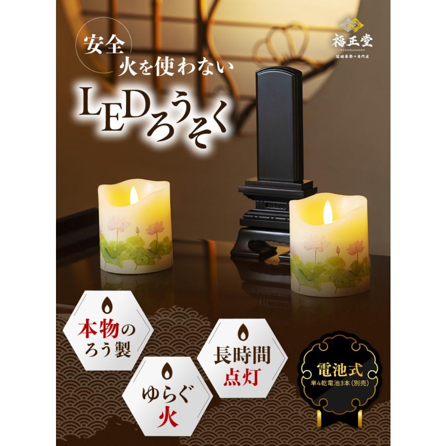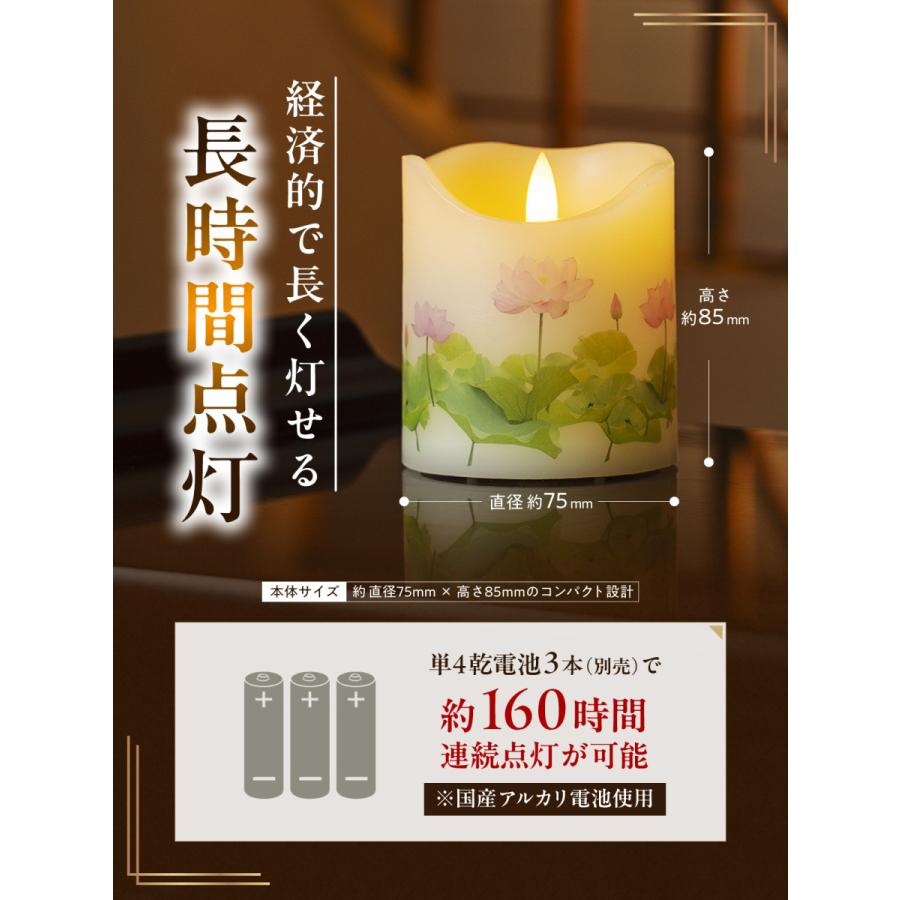単4乾電池3本で約160時間連続点灯(電池別売り)。日々のお参りや法事、お盆、命日など長時間使用にも対応。