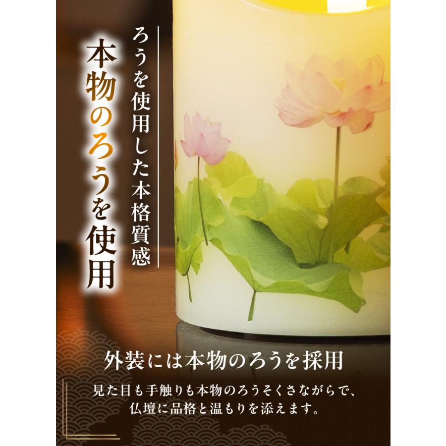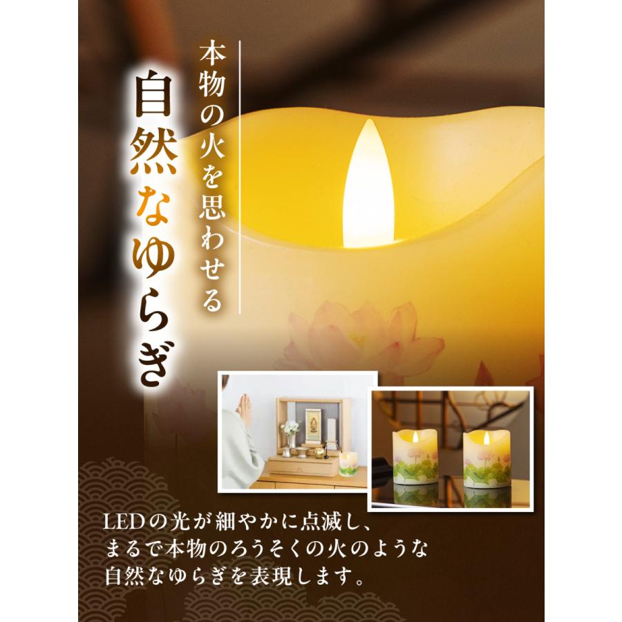 外装は本物のろう製で、見た目も手触りも本物のろうそくそのもの。優しい炎のゆらめきが、お参りの空間に温もりを加えます。
