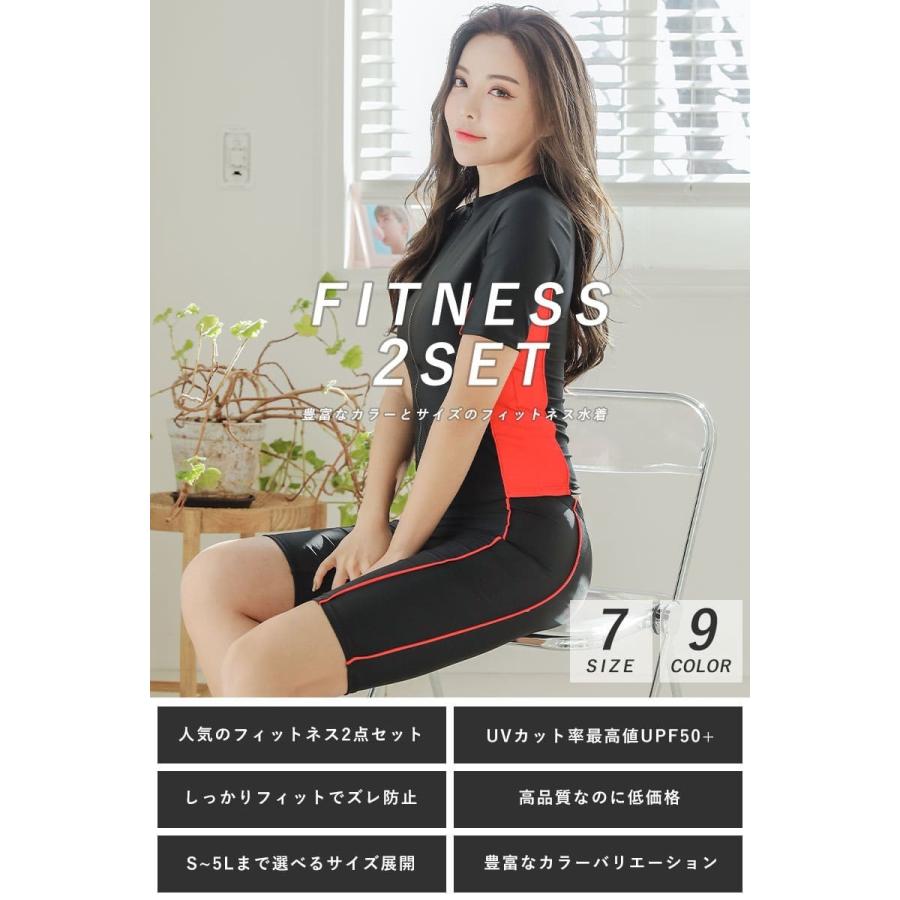 水着 レディース フィットネス水着 セパレート 水着 半袖 めくれ防止 ジム プール 競泳水着 フロントジッパー 2点セット