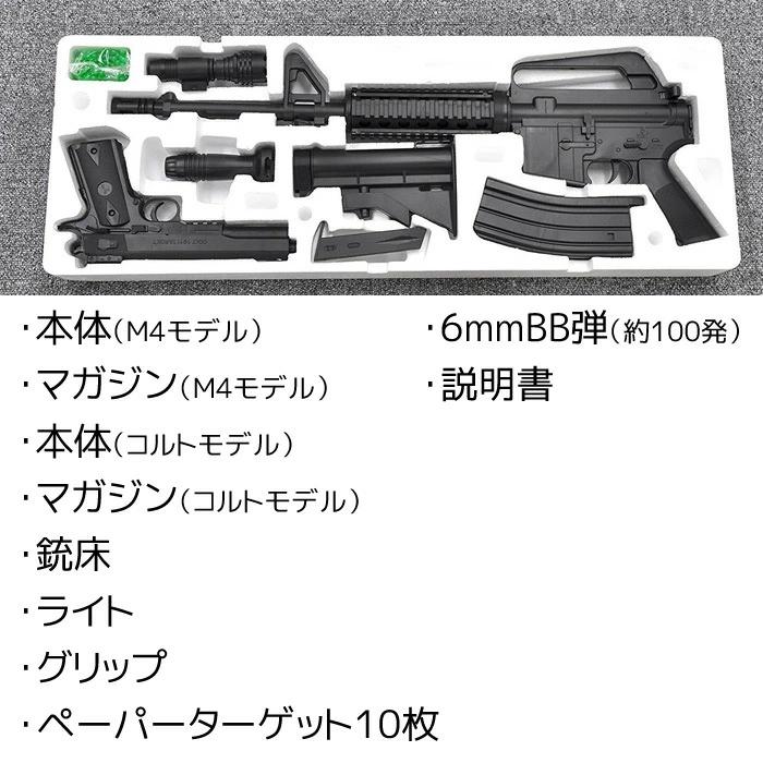 本体(コルトモデル)、マガジン(コルトモデル)、ペーパーターゲット、6mmBB弾、取扱説明書