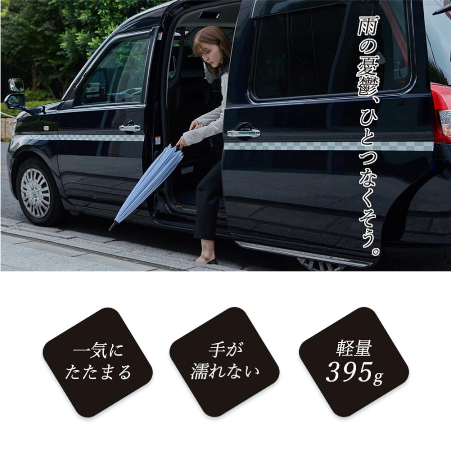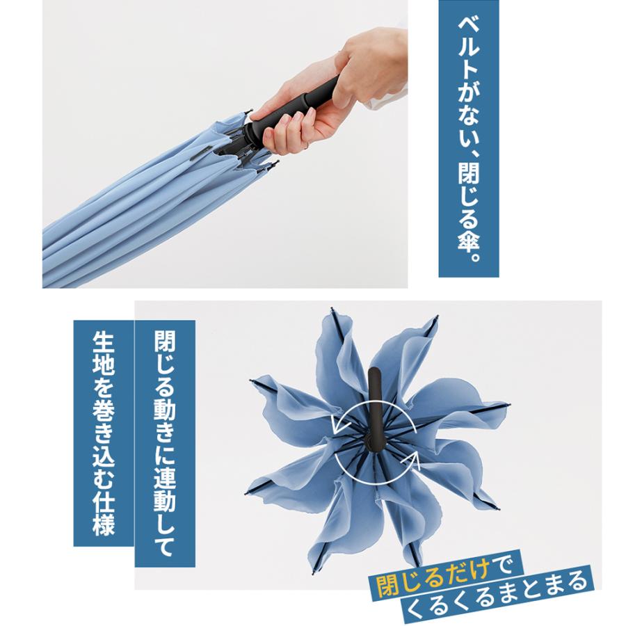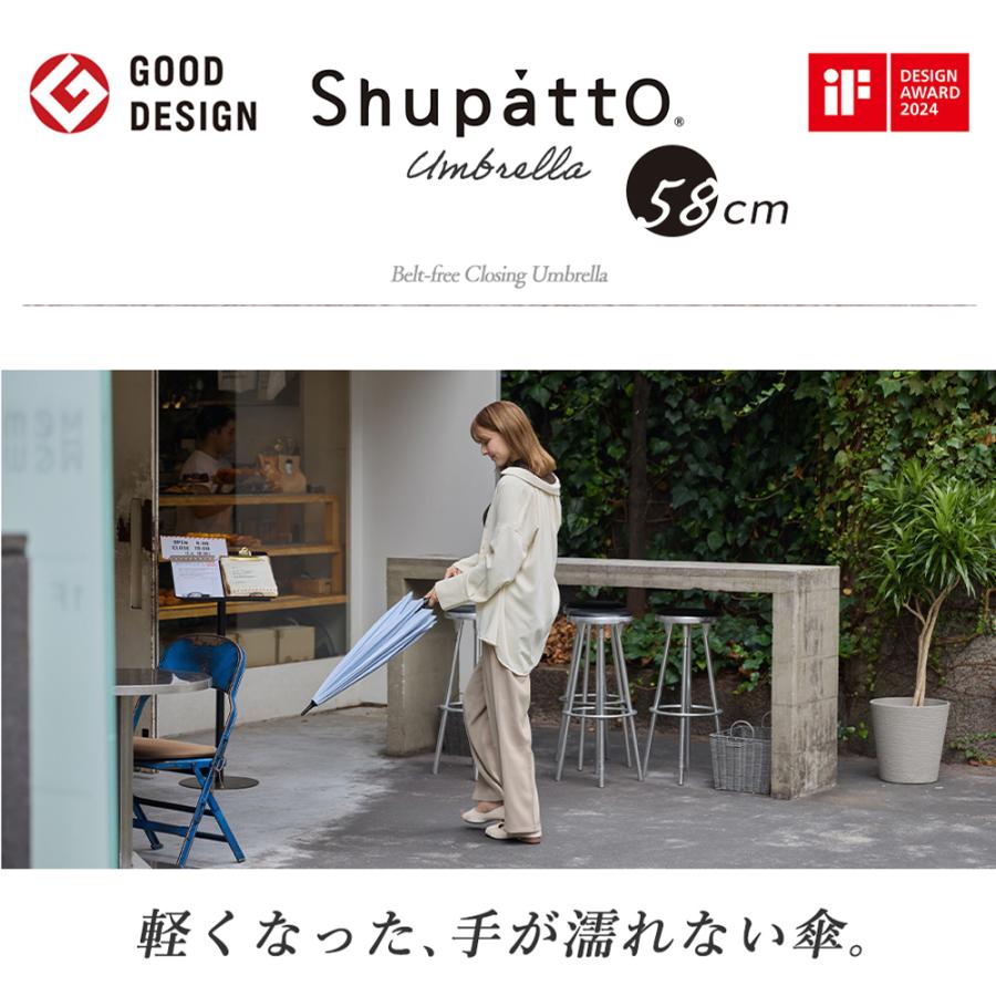 Shupatto アンブレラ(シュパット傘)は、ベルトがなく、とじるだけで一気にたためる新構造の傘。閉じる動きに連動して骨が回転し、生地をくるくると自動で巻き込むため、手でまとめたりベルトで留めたりする手間がありません。使いやすさはそのままに軽量化を実現し、持ち歩きの負担を軽減。さらにカラーバリエーションも一新し、より洗練されたラインアップに生まれ変わりました。スライダーを上げ下げするだけで開閉できるボタンレスロック方式を採用。ボタン操作不要でスムーズに開閉できます。また、中開き状態で固定できる乾燥用ストッパー機能付きで、使用後は立てたまま乾かすことが可能です。サイズは58cmと65cmの2種類。軽やかで持ちやすい58cmと、しっかり覆える安心サイズの65cmからお選びいただけます。UVカット率96.2%/UPF50+で晴雨兼用にも対応。折りたたみ不要・ベルト不要・ワンタッチ感覚でたためる、毎日使いたくなる機能的な一本です。