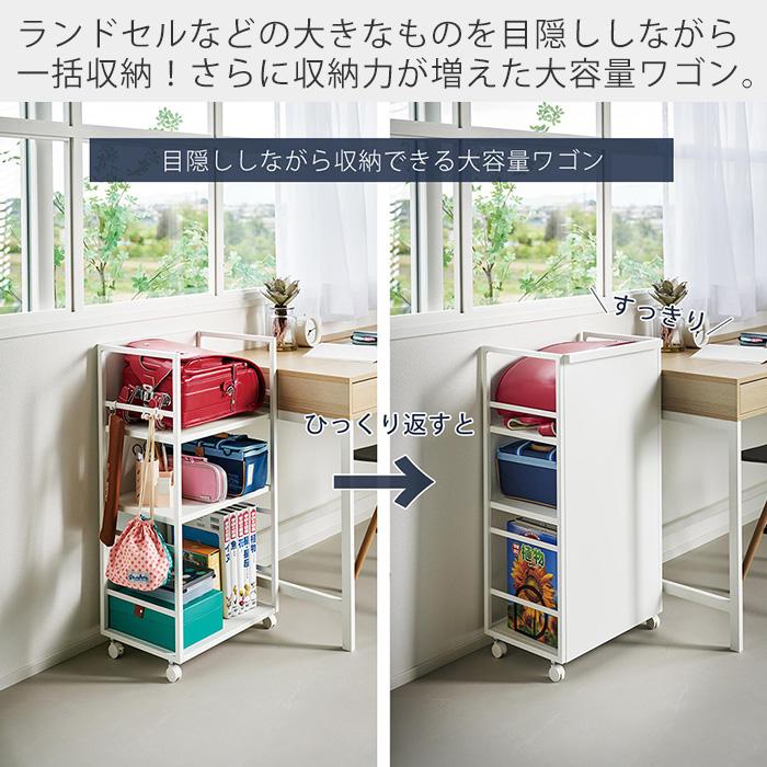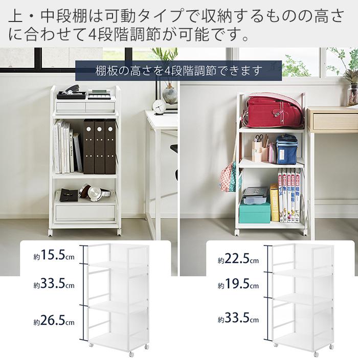 お子様の学用品やリビングのアイロン用品など様々なシーンで活躍する3段のトールワゴン。