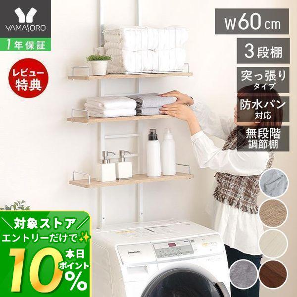 天井に突っ張るだけでしっかり固定でき、防水パン対応だから限られたスペースにもぴったり。棚板の幅は60cmと幅広く、洗濯機ラックとして洗剤や柔軟剤、タオルなどをすっきり整理できます。
