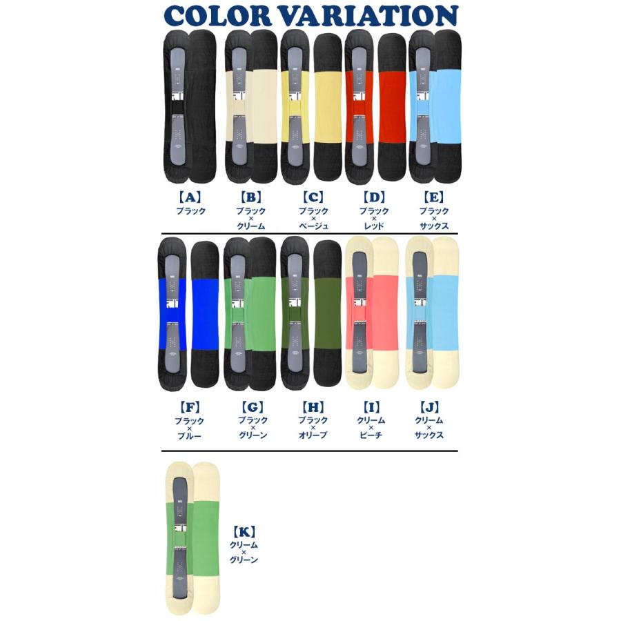 大切な滑走面、エッジを保護する簡易ソールカバー。 プチトリップや車での積載時に内装を傷つけず便利です。 車載時には車内の傷つきや、ワックス塗装面保護 錆び防止、水濡れも予防します。 センターのマジックテープベルトでしっかり固定。 ボードーケース内のインナーとしても最適です♪トラブルの回避に是非。 ※こちらの商品はコストパフォーマンス重視のため、持ち手はついておりません ■カラー【A】BK:ブラック【B】BKCR:ブラック×クリーム【C】BKBE:ブラック×ベージュ【D】BKRD:ブラック×レッド【E】BKSA:ブラック×サックス【F】BKBL:ブラック×ブルー【G】BKGR:ブラック×グリーン【H】BKOL:ブラック×オリーブ【I】CRPC:クリーム×ピーチ【J】CRSA:クリーム×サックス【K】CRGR:クリーム×グリーン ■サイズ S:138〜148cm M:145〜156cm L:152〜162cm ■材質 ポリエステル100%(フリース地) スノーボード ソールカバー ボードカバー ケース 板 収納 スノボ SNOWBOARD COVER リバースエッジ エッジ