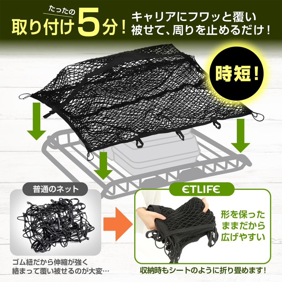 ルーフキャリアやルーフラックの上にフワッと覆い被せて周りを止めるだけで簡単に装着できます。ゴム紐状のネットの様には絡まりません。