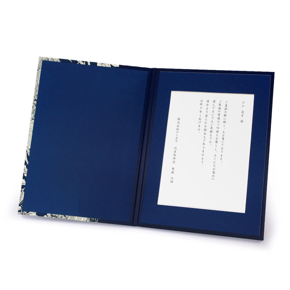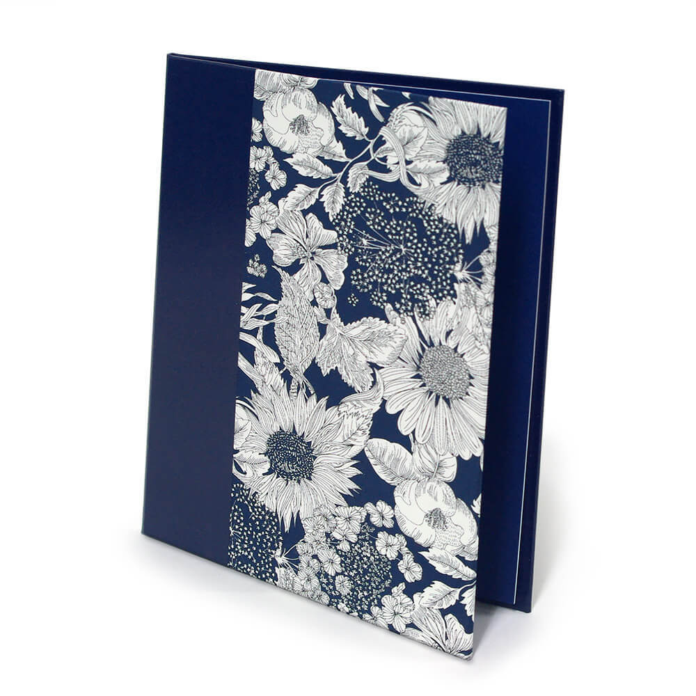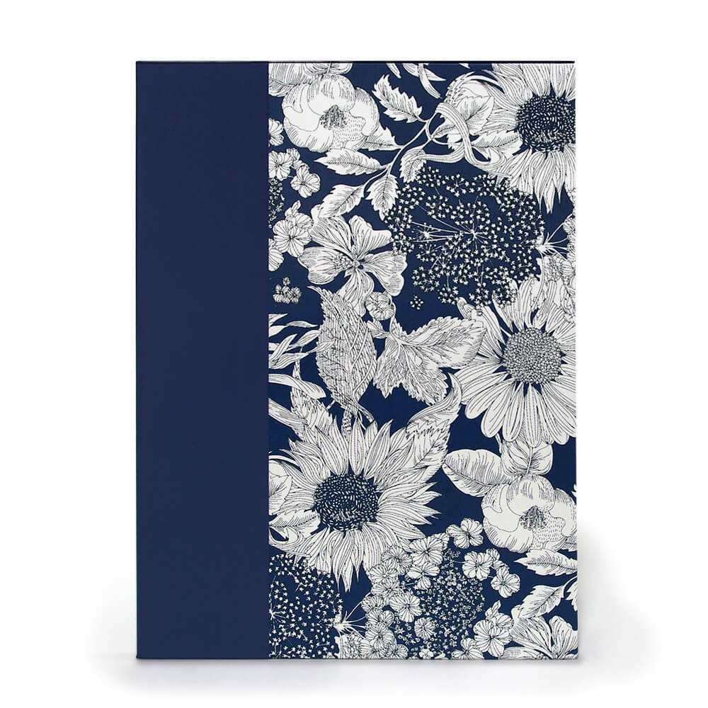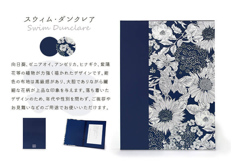 落ち着いた紺色の布地に向日葵、ヒナギク、シャクヤクなどが描かれています。
