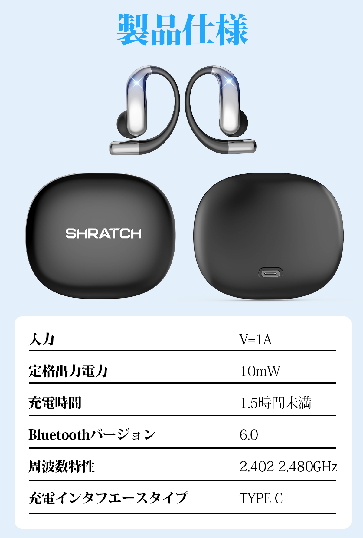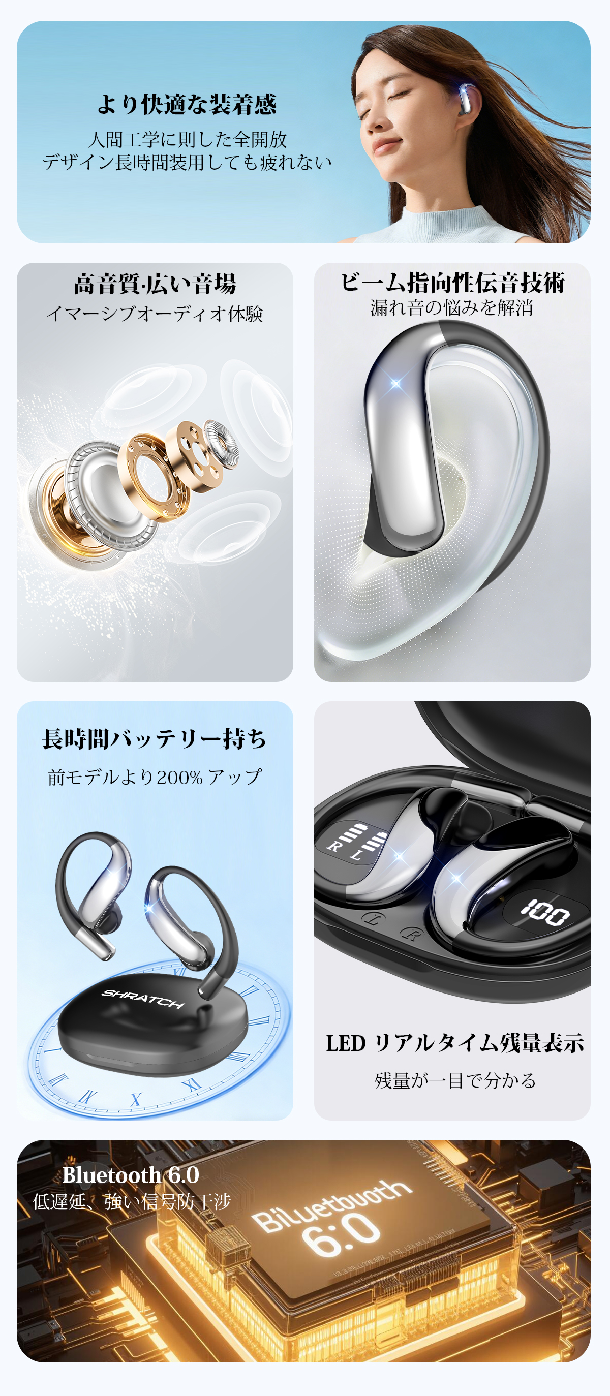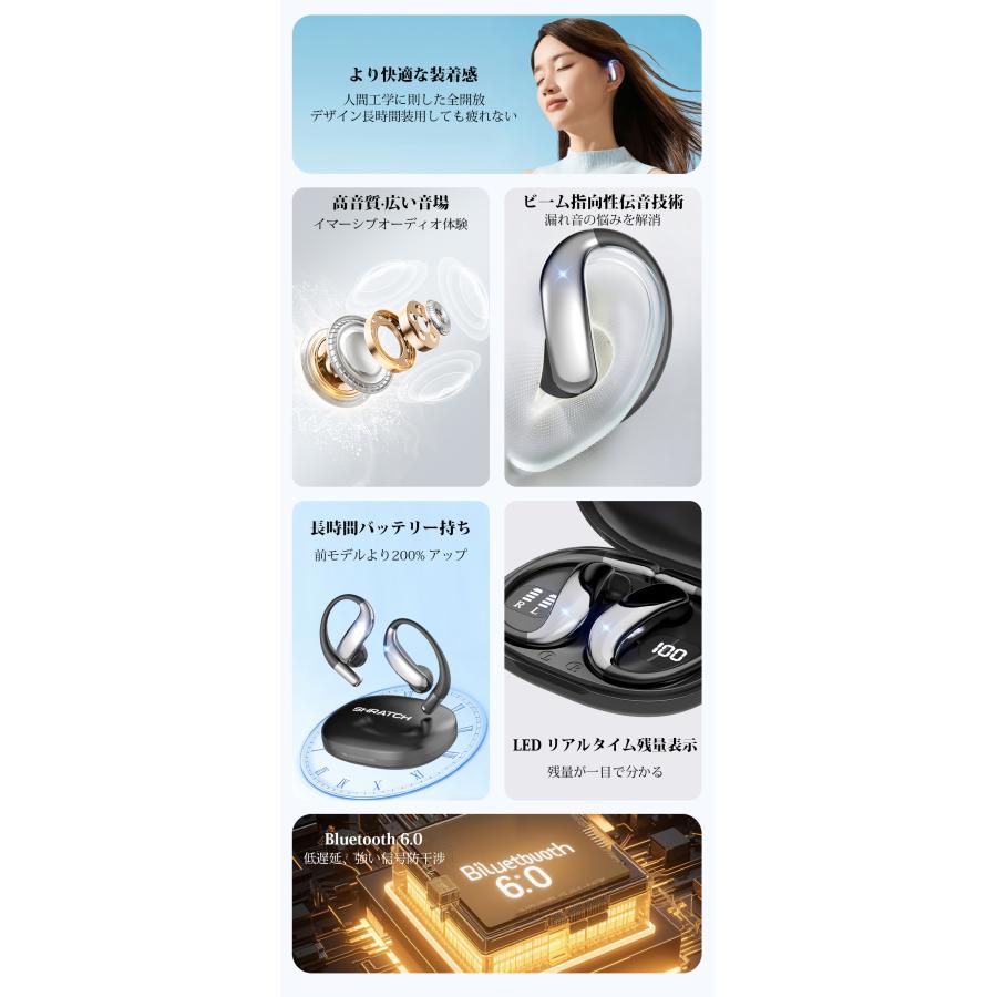 ワイヤレスイヤホン 骨伝導 イヤホン bluetoothイヤホン SHRATCH オープンイヤー型 耳を塞がない 耳掛け式 イヤフォン 残量表示 音漏れ抑制 急速充電