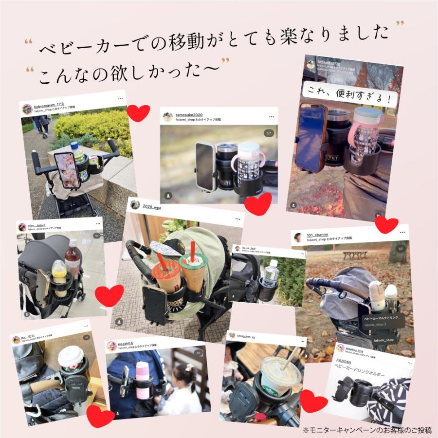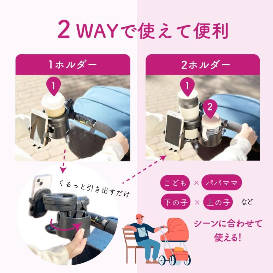 ベビーカーに取り付けて、2つの飲み物とスマホが置けるベビーカードリンクホルダー。