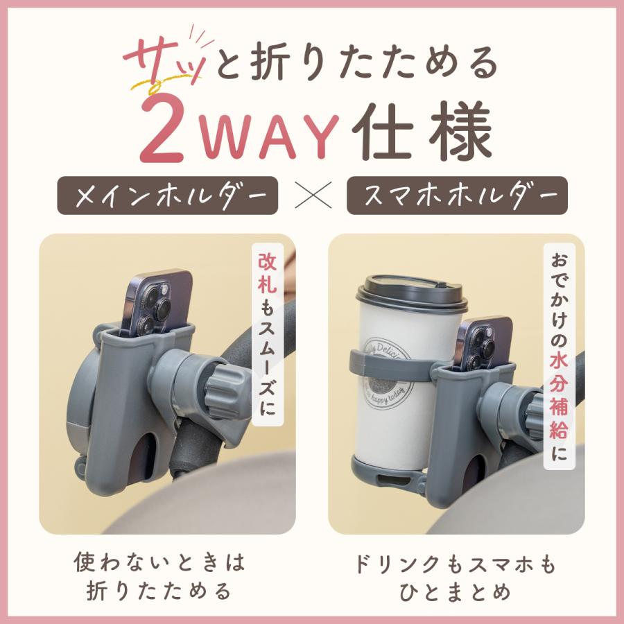 6.9インチまでの大きめのスマホにも対応したスマホホルダー付きで、両手をふさがず手ぶらでベビーカーを押せます。