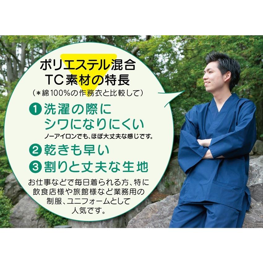 | 特徴 | メンズTC作務衣 ポリエステル混合なので洗濯してもシワになりにくく、乾きやすいので、飲食店や居酒屋さん、旅館など業務用の制服、ユニフォーム向きの作務衣です。 中国製 製造時期によって気温や湿度の影響で色が異なってしまう場合がございます。 (ご注意)前ファスナーは、つまみを起こして、ファスナーロックを外してから、ファスナーの上げ下げをして下さい。ファスナーロックが掛かった状態のまま動かすと、当然ファスナーが壊れますのでご注意下さい。 |