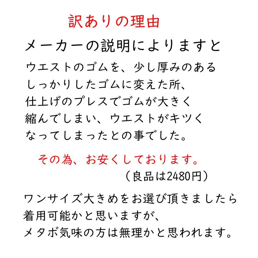 メーカーの説明によりますと、ウエストのゴムをこれまでより少し厚めのいいゴムに変えた所、仕上げのプレスでゴムが大きく縮んでしまい、ウエストがキツめになってしまったとの事でした。その為、お値段をお安くしております。(良品だと2480円で販売)ワンサイズ大きめをお選び頂きますと着用可能かと思います。