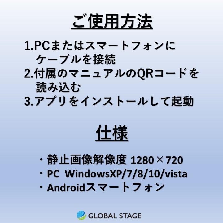・付属のマニュアルのQRコードを読み込み、アプリをダウンロードしてご使用ください。(アプリに端末が対応していない場合は、USBCamera等のアプリをご自身で取得してご使用頂く事も可能です。)
