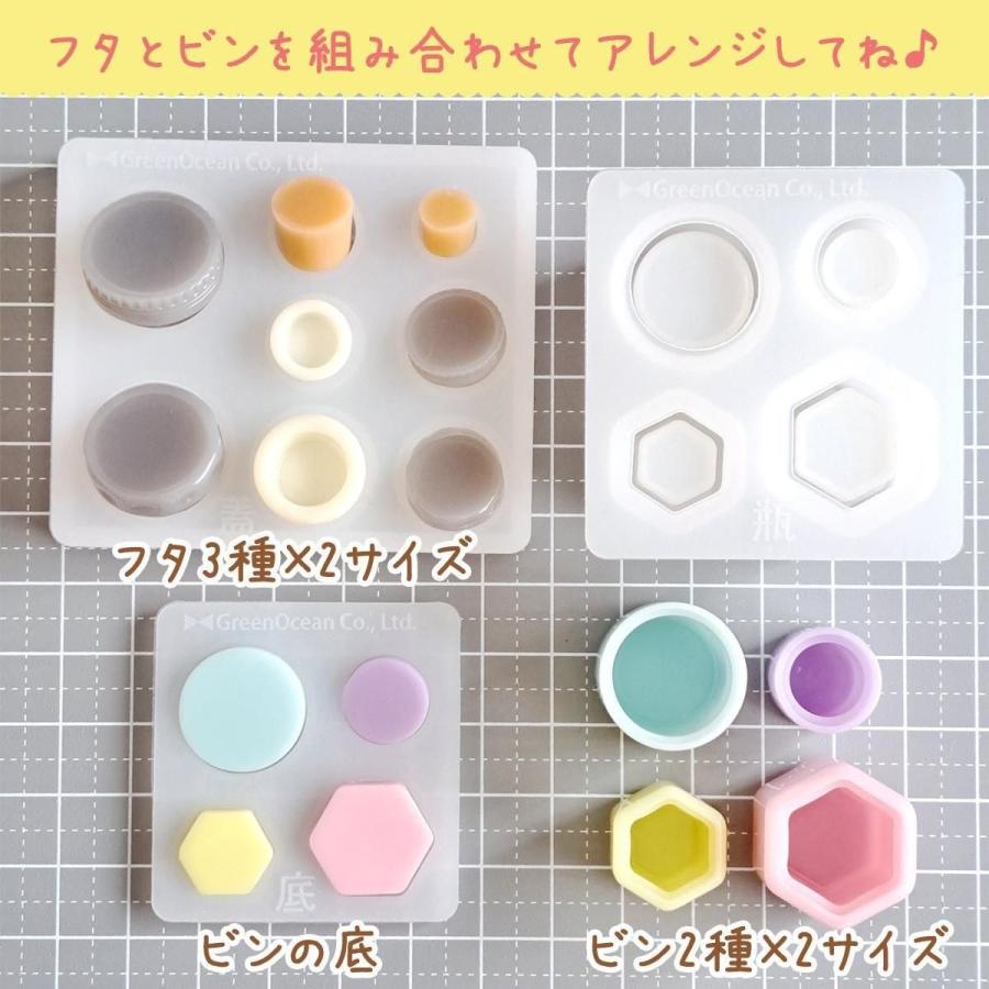2026謎福袋に入っていた、ミニチュア小瓶が作れるGreenOceanオリジナルシリコンモールド。ビンは2種類、フタは3種類、それぞれ2サイズを組み合わせていろんな形に作れるよ。