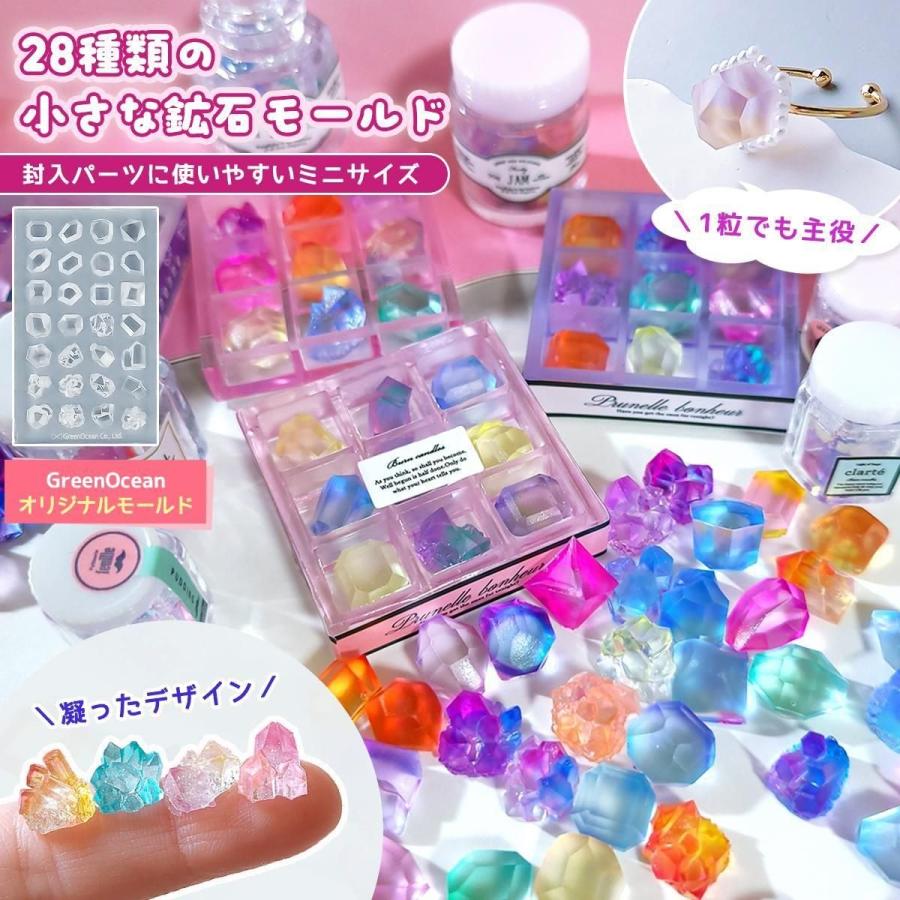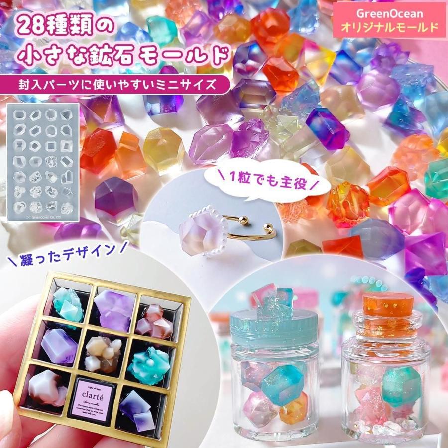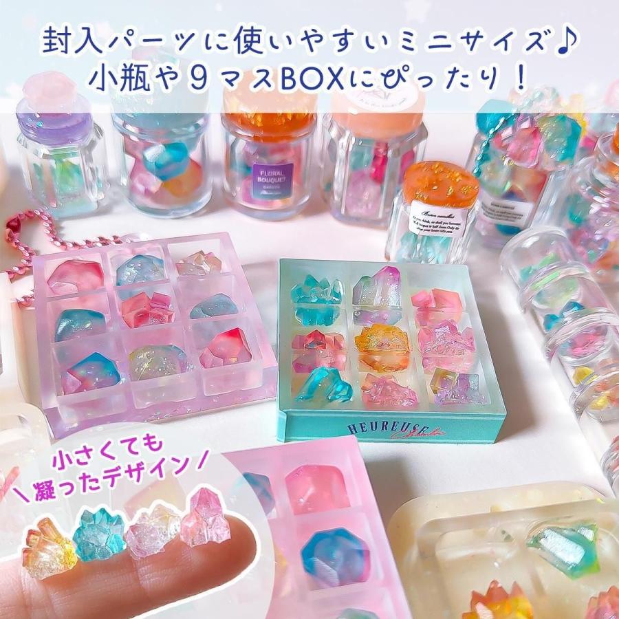 鉱石のデザインはなんと28種類!封入パーツに使いやすい小さなサイズだから、チョコモールドの箱(型番 26218-G)や、ミニ小瓶(型番 28344-G)に入れるとすごく可愛いよ。人気のパッケージモールドや巾着モールドにたっぷり詰めるのもおすすめ♪さらに鉱石の作品にぴったりな装飾シール(型番 28272-G)もあるよ。貼るだけで一気に本格的な作品に!是非チェックしてみてね^^