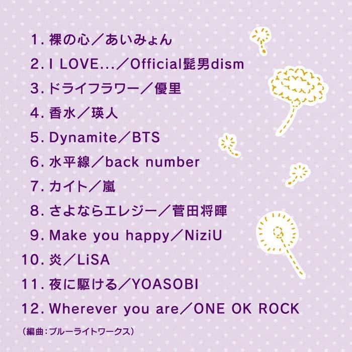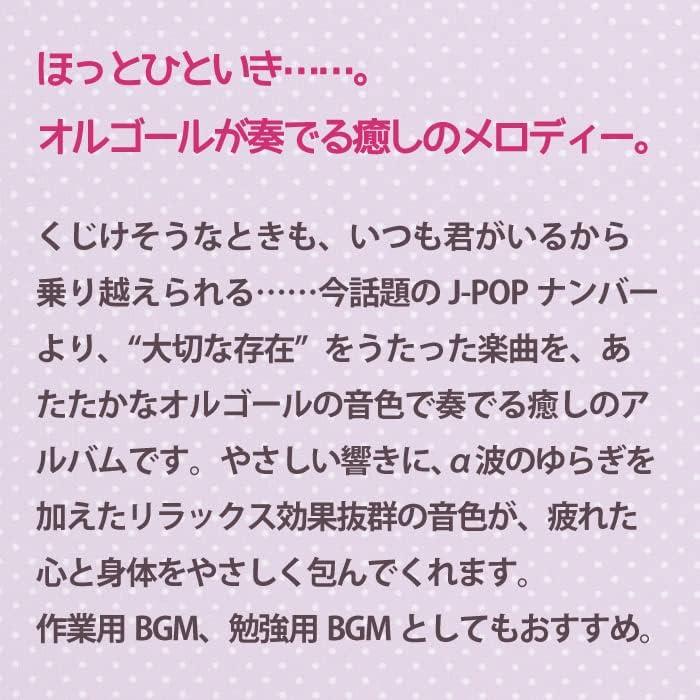 話題のJ-POP人気ナンバーより、“大切な人の存在"をうたった楽曲を厳選し、心あたたまるオルゴールの音色でアレンジした、癒しのオルゴール・アルバムです。あいみょんの「裸の心」をはじめ、海外でも人気のBTS「Dynamite」やアニメ『鬼滅の刃』劇場版の主題歌「炎」など、お馴染みのメロディーを全12曲、オルゴール・アレンジにα波を誘発させるゆらぎ音を重ねてお届けします。毎日のリラックス・タイムに、ご友人や家族へのプレゼントにもオススメの1枚です。このCDに収録されている「α波オルゴール」の美しい響きは、大脳生理学的に配慮された微妙な音のゆらぎ信号が含まれています。このゆらぎ信号でαが誘発されることにより、心と身体をリラックスさせ、さまざまな能力を発揮させることが期待できます。