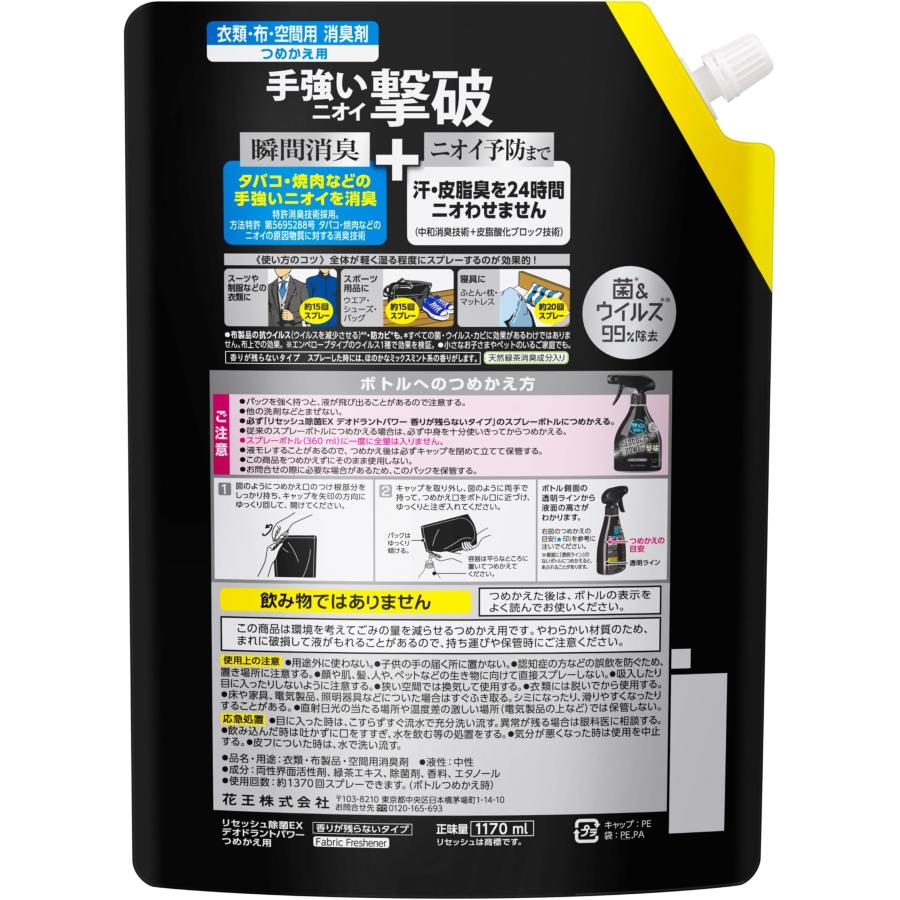 香り:香りが残らないタイプブランド:リセッシュ商品の形状:スプレーユニット数:1 個商品の個数:1梱包サイズ:24.3 x 17.8 x 6.8 cm; 1.19 kg香りの系統:香りが残らないタイプ【高さ×幅×奥行き】280x 200 x 120[ミリメートル]1.17 [Litter]成分:両性界面活性剤、緑茶エキス、除菌剤、香料、エタノール手強いニオイを撃破!◆体臭・タバコ・焼肉などのニオイを瞬間消臭。◆汗・皮脂臭を24時間ニオわせない(中和消臭技術+皮脂酸化ブロック技術)。◆タバコ・焼肉などのニオイの原因物質に対する特許消臭技術「デオドライザーZ」採用。◆菌・ウイルス※を99%除去*。*すべての菌・ウイルスを除去するわけではありません。布上での効果。※エンベロープタイプのウイルス1種で効果を検証。◆香りが残らないタイプ。